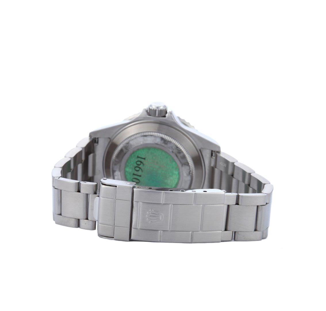 One gents stainless steel Rolex Submariner Anniversary Edition wristwatch. Model Name/Number: Submariner 16610v. The watch features automatic movement with date, waterproof screw-down crown, unidirectional rotatable diver's bezel, scratch-resistant sapphire crystal. Case: Stainless steel with green anniversary edition bezel, no holes case. Dial: Black with luminous markers. Bracelet: Stainless Steel Oyster.