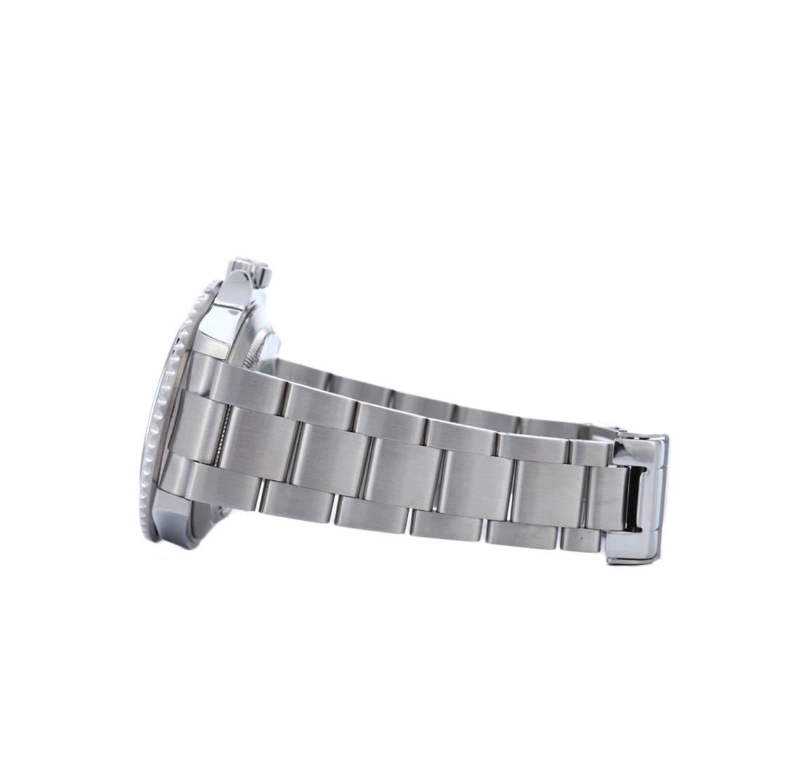 One gents stainless steel Rolex Submariner Anniversary Edition wristwatch. Model Name/Number: Submariner 16610v. The watch features automatic movement with date, waterproof screw-down crown, unidirectional rotatable diver's bezel, scratch-resistant sapphire crystal. Case: Stainless steel with green anniversary edition bezel, no holes case. Dial: Black with luminous markers. Bracelet: Stainless Steel Oyster.