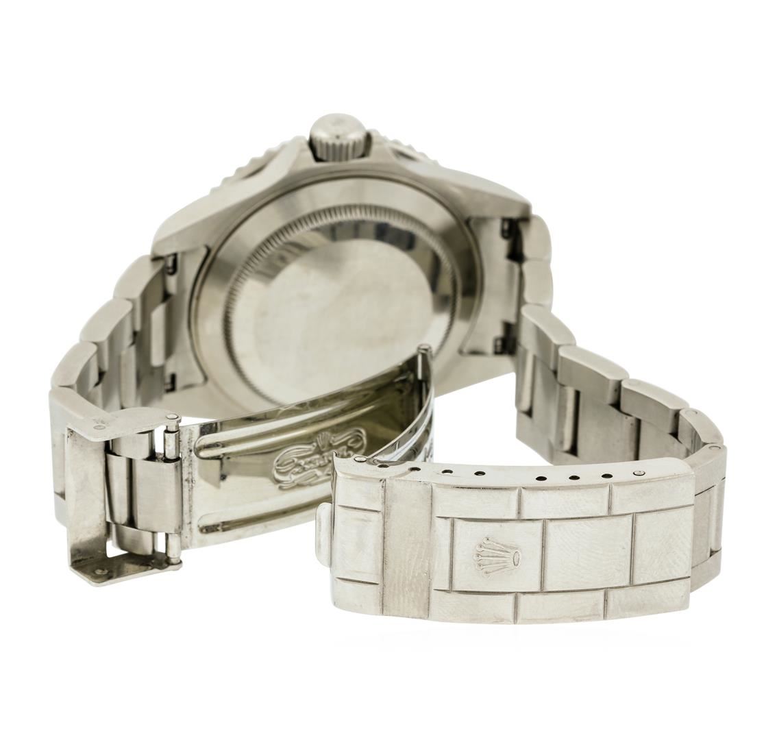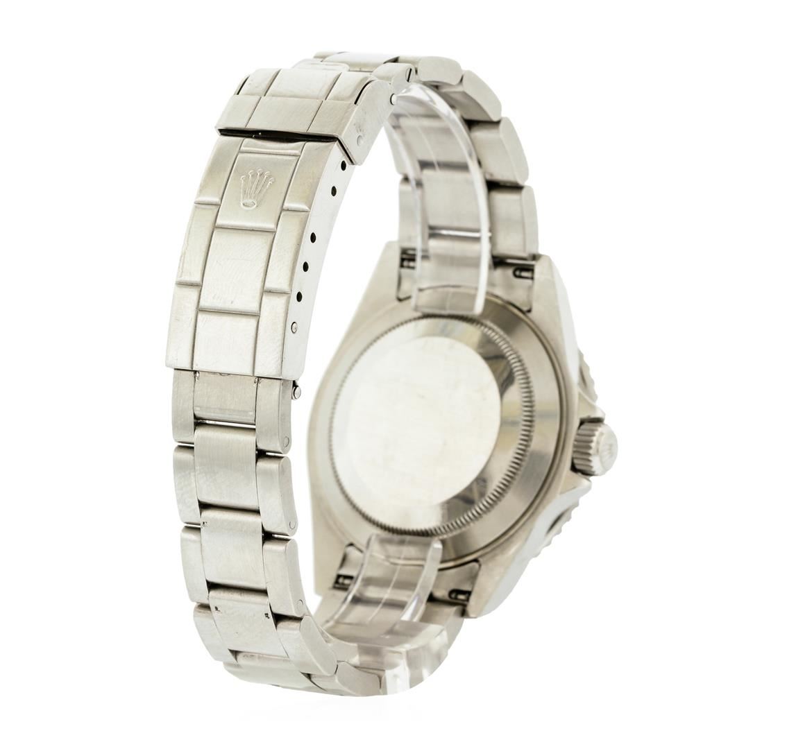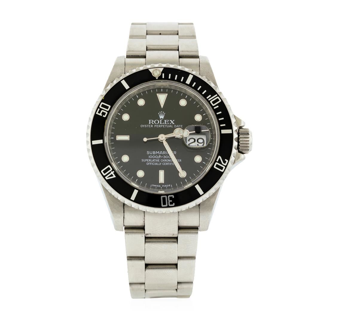 One gents, hand crafted & machine milled Rolex Stainless Steel Submariner Date model wristwatch electronically tested, Case: 40mm oyster, Water Resistant: 300 meters / 1000 feet, Crown: twin lock with logo, set within protective shoulders, Bezel: Black insert, uni-directional sixty minute time lapse rotatable disc, Rolex Hallmarked Crystal: synthetic sapphire cyclops lens. Movement: superlative chronometer, Rolex signed Dial: Black, with luminous hands, indices, and a bordering minute track, Date Window: 3 o'clock position quick set, Rolex Oyster Bracelet: stainless steel, oyster flip lock clasp with divers extension, Condition: G-5 Fine. Eight inch length, adjustable. Circa: 2008.Total Weight of Watch 135.00gm. AIG Appraised at $7,440.00.