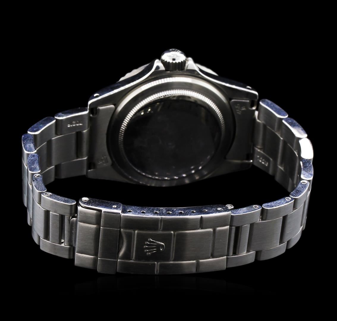 One, hand crafted & machine milled Rolex Stainless Steel Submariner model wristwatch electronically tested, Case: 39mm oyster, Water Resistant: 200 meters / 660 feet, Crown: twin lock with logo, set within protective shoulders, Bezel: Black disc, bi-directional sixty minute time lapse, Custom Crystal: acrylic cyclops lens. Movement: superlative chronometer, Dial: Black, with luminous hands and indices, Circa: 1977, Calendar: non-quick set, Bracelet: stainless steel oyster, Flip lock clasp: without the diver's extension, Condition: G-4 Average. Eight and one half inch length, adjustable. Total Weight of Watch 128.57gm. AIG Appraised at $6,880.00.