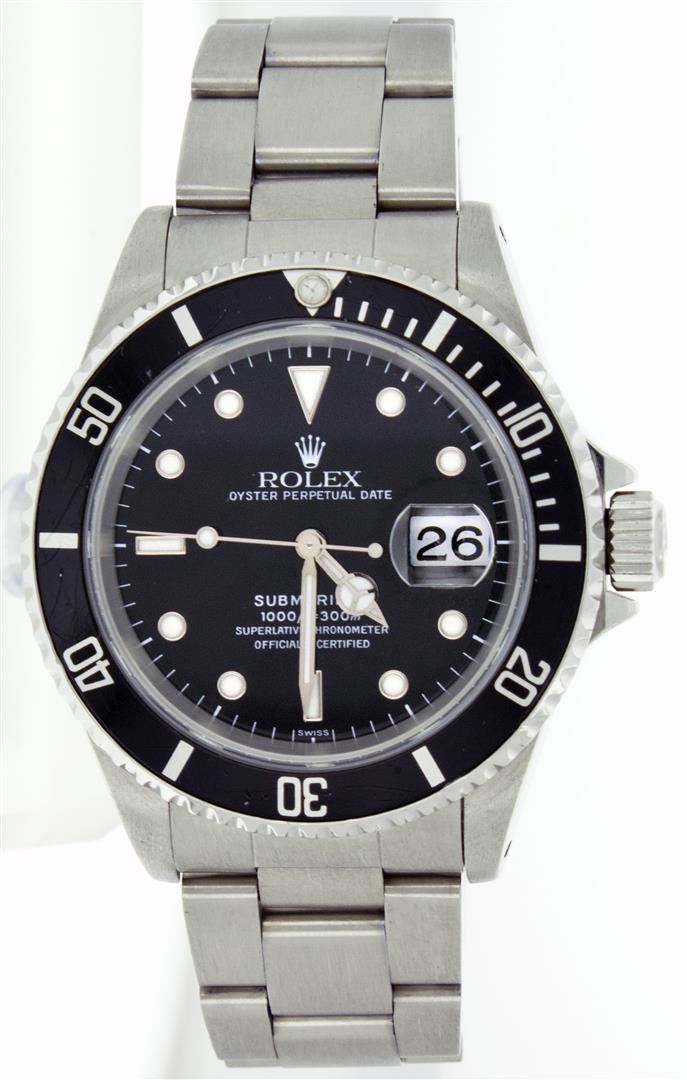 One Gents Rolex Submariner Polished, Serviced & Electronically Tested, Stainless Steel Case:41mm, Stainless Steel Crown, Bezel: Black Submariner Bezel. Crystal: Synthetic Sapphire Cyclops Lens. Movement: Automatic Winding Movement Caliber 3135. Dial: Black Dial. Date Window: 3 O'Clock Position Date Display, Model: 16610 Condition: G-6 Extra Fine. Bracelet: Stainless Steel Oyster. Bright Polish & Satin Finish. 6.75 Inch Length, Adjustable. Standard Clasp, With Rolex Logo.