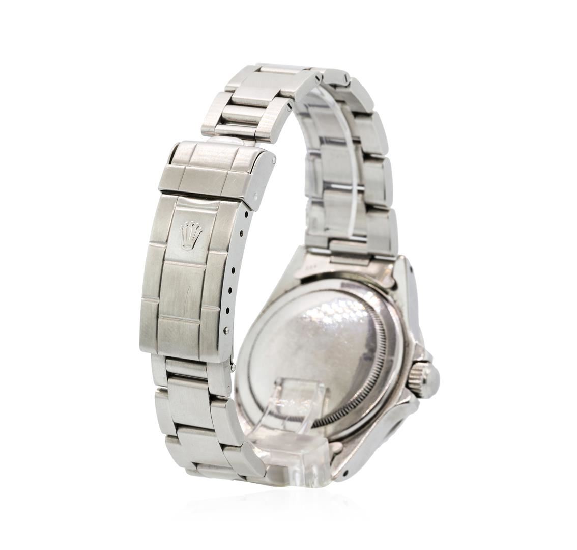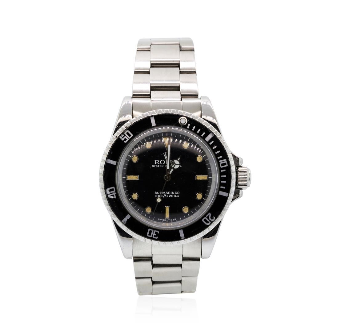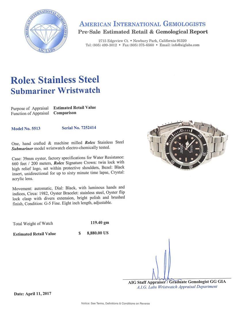 One, hand crafted & machine milled Rolex Stainless Steel Submariner model wristwatch electro-chemically tested.Case: 39mm oyster, factory specifications for Water Resistance: 660 feet / 200 meters, Rolex Signature Crown: twin lock with high relief logo, set within protective shoulders, Bezel: Black insert, unidirectional for up to sixty minute time lapse, Crystal: acrylic lens.Movement: automatic, Dial: Black, with luminous hands and indices, Circa: 1982, Oyster Bracelet: stainless steel, Oyster flip lock clasp with divers extension, bright polish and brushed finish, Condition: G-5 Fine. Eight inch length, adjustable. Total Weight of Watch 119.40gm. AIG Appraised at $8,880.00.