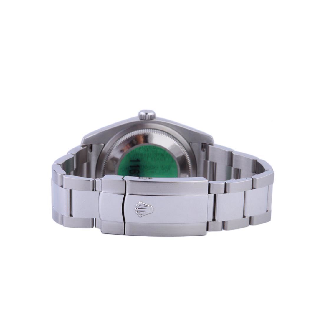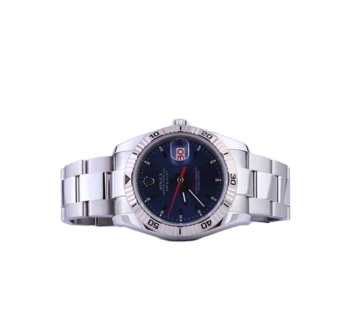 One gents stainless steel Rolex DateJust wristwatch. Model Name/Number: Thunderbird DateJust 116264. The watch features automatic movement with date, scratch-resistant sapphire crystal, 31 jewels, waterproof screw-down crown. Case: Stainless steel with18k white gold Thunderbird (rotatable timing) bezel (36mm). Dial: Blue luminous index with red second hand and red date wheel. Bracelet: Stainless steel Oyster.