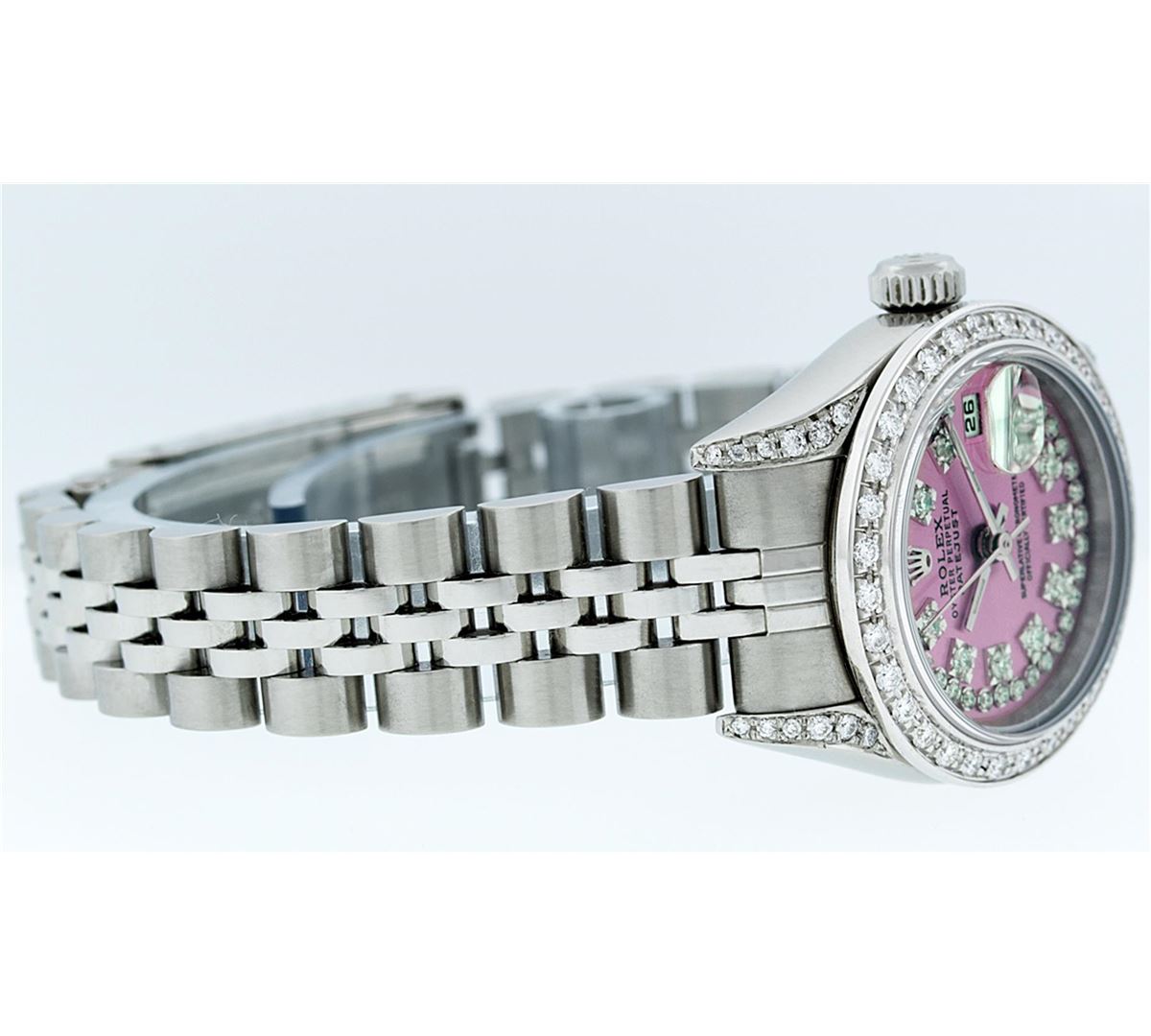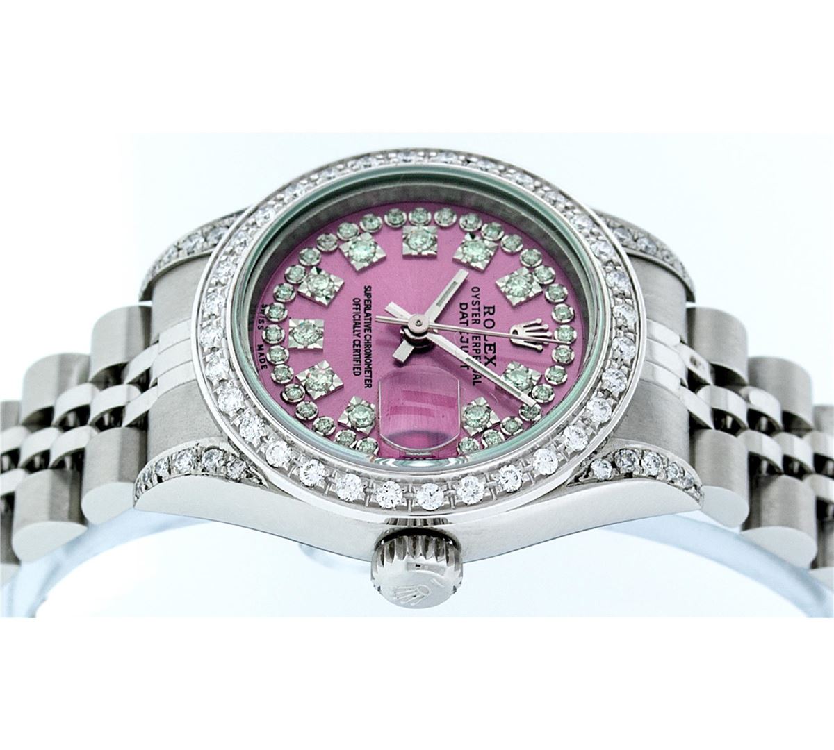 One Ladies Rolex Datejust Polished Bright with Satin Finish, Serviced & Electronically Tested, Stainless Steel Case:26mm, Stainless Steel Crown, Diamond Lugs: 16 Diamonds On Lugs, Clarity: SI-VS, Color: G to H. Custom Bezel: 18K White Gold Beadset Bezel, Diamond Count: 32 Diamonds, Total Weight 1.00 Carat, Clarity: SI-VS, Color: G to H. Custom Crystal: Synthetic Sapphire Cyclops Lens. Movement: Automatic Winding Movement Caliber 2235. Custom Dial: Refinished Pink With String Diamond Dial VVS, 43 Diamonds in Dial G To H In Color, Clarity: VVS. Date Window: 3 O'clock Position Date Display, Model: No Hole Quickset Datejust. Condition: G-6 Extra Fine. Bracelet: Stainless Steel Jubilee Band. Bright Polish & Satin Finish. 6.0 Inch Length, Adjustable. Standard Clasp, With Rolex Logo. Comes with 6 month warranty.