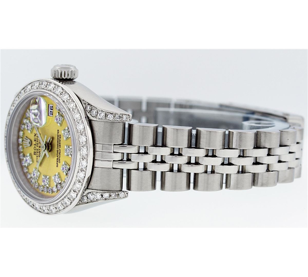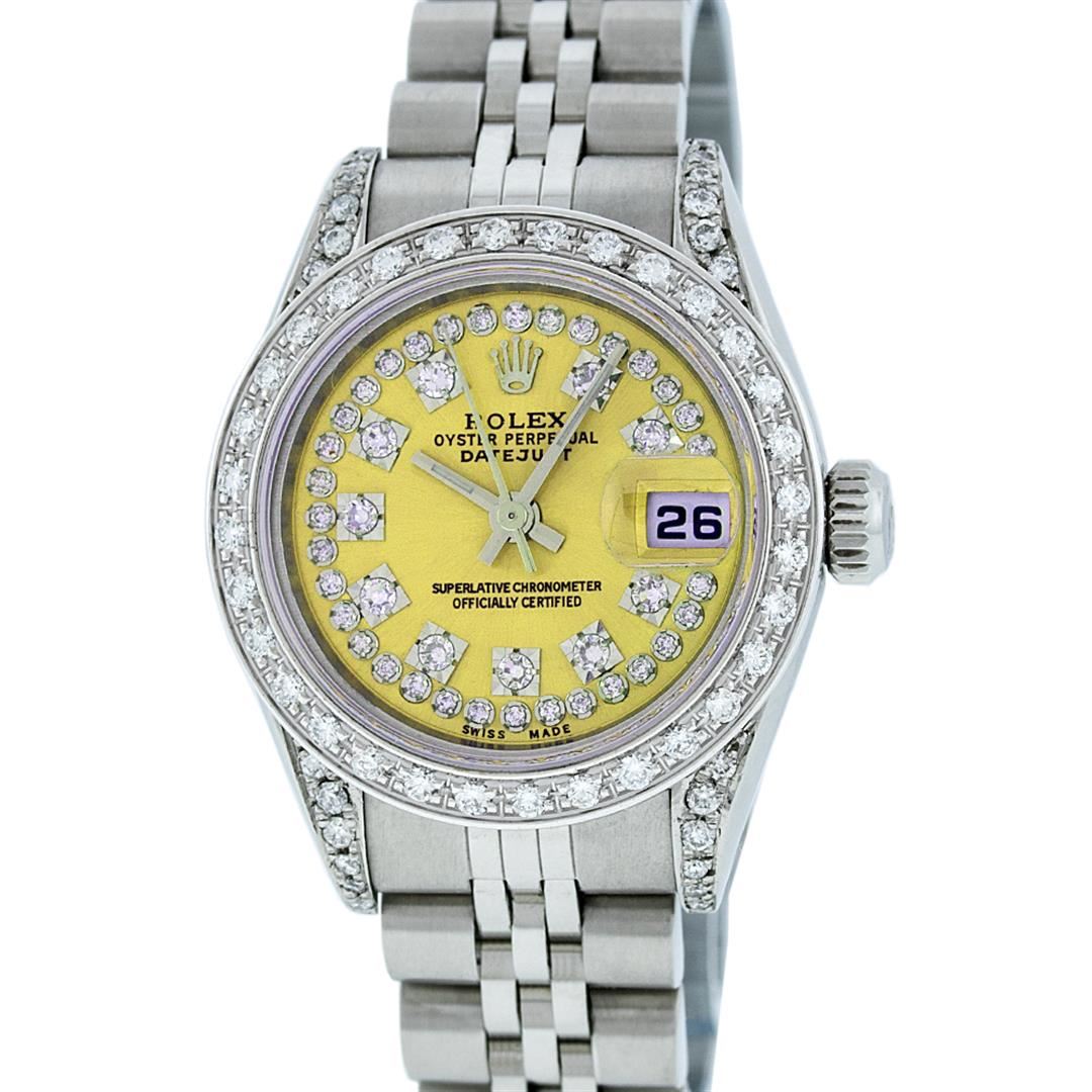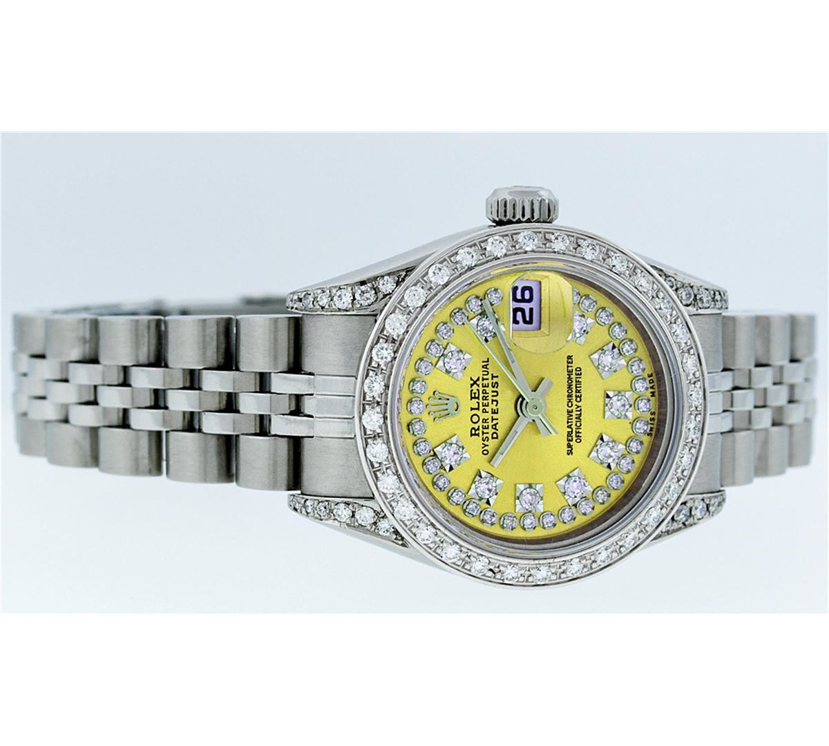 One Ladies Rolex Datejust Polished Bright with Satin Finish, Serviced & Electronically Tested, Stainless Steel Case:26mm, Stainless Steel Crown, Diamond Lugs: 16 Diamonds On Lugs, Clarity: SI-VS, Color: G to H. Custom Bezel: 18K White Gold Beadset Bezel, Diamond Count: 32 Diamonds, Total Weight 1.00 Carat, Clarity: SI-VS, Color: G to H. Custom Crystal: Synthetic Sapphire Cyclops Lens. Movement: Automatic Winding Movement Caliber 2235. Custom Dial: Refinished Yellow With String Diamond Dial VVS, 43 Diamonds in Dial G To H In Color, Clarity: VVS. Date Window: 3 O'clock Position Date Display, Model: No Hole Datejust Quickset. Condition: G-6 Extra Fine. Bracelet: Stainless Steel Jubilee Band. Bright Polish & Satin Finish. 6.0 Inch Length, Adjustable. Standard Clasp, With Rolex Logo. Comes with 6 month warranty.