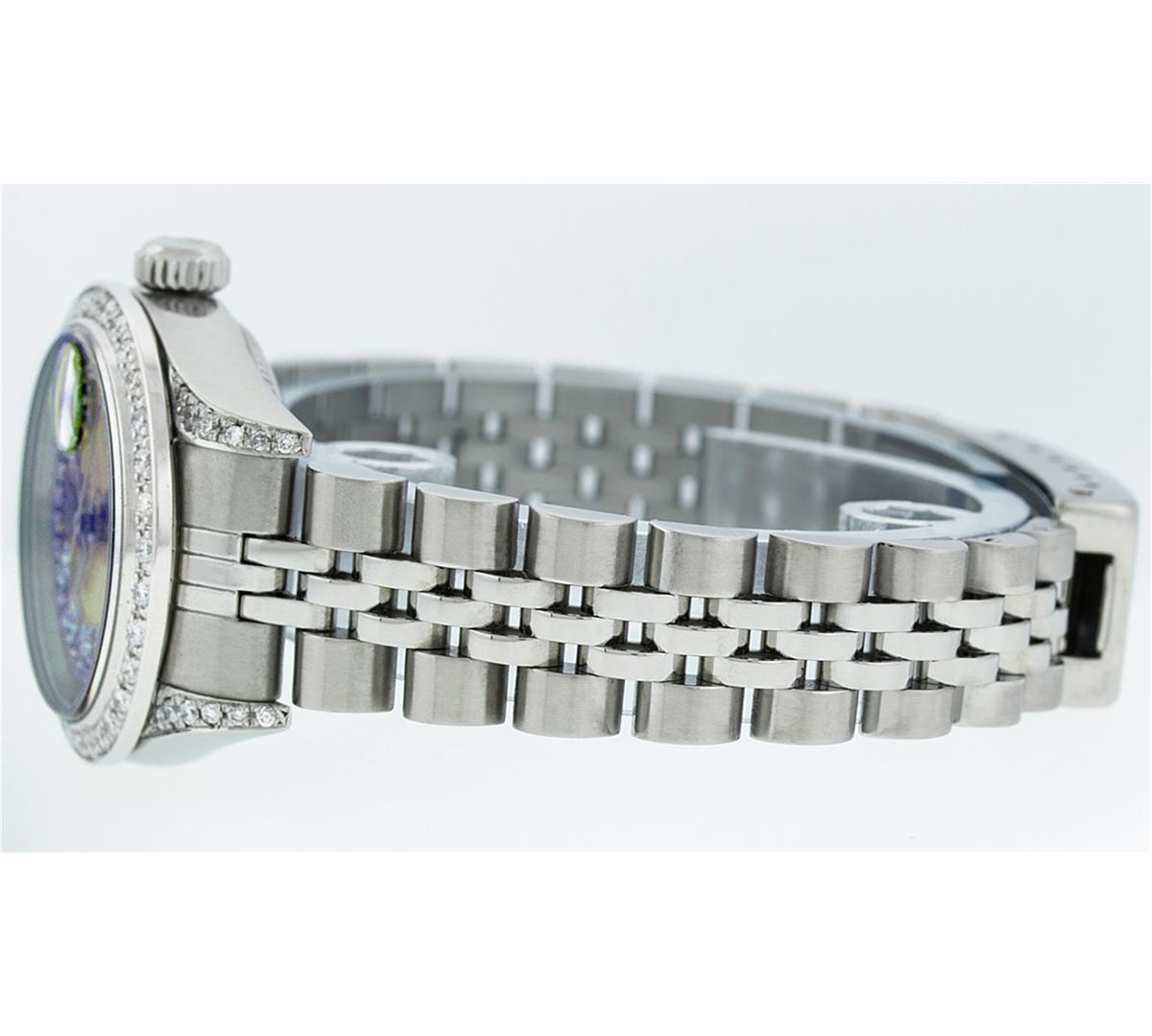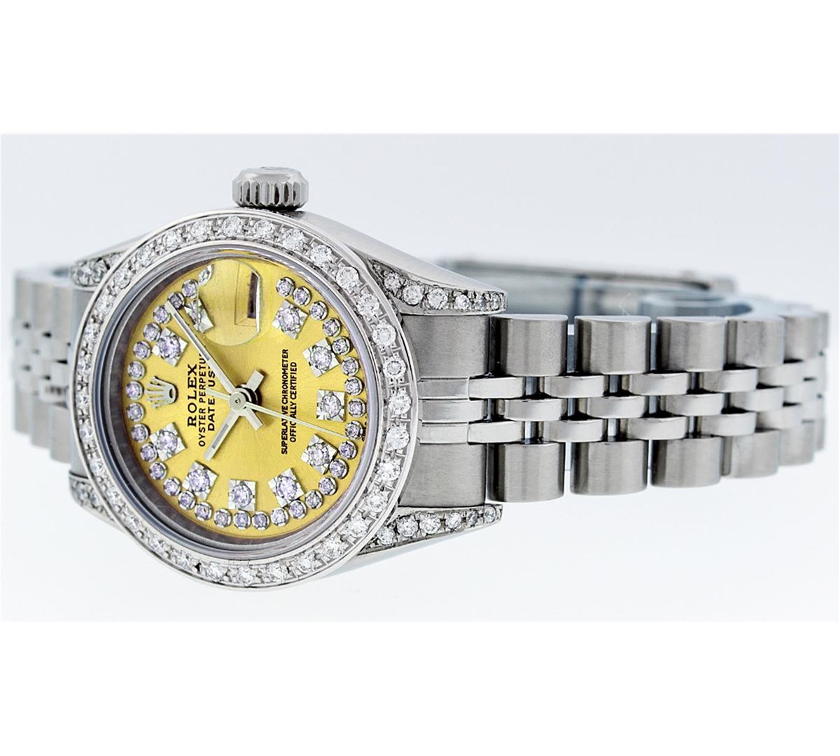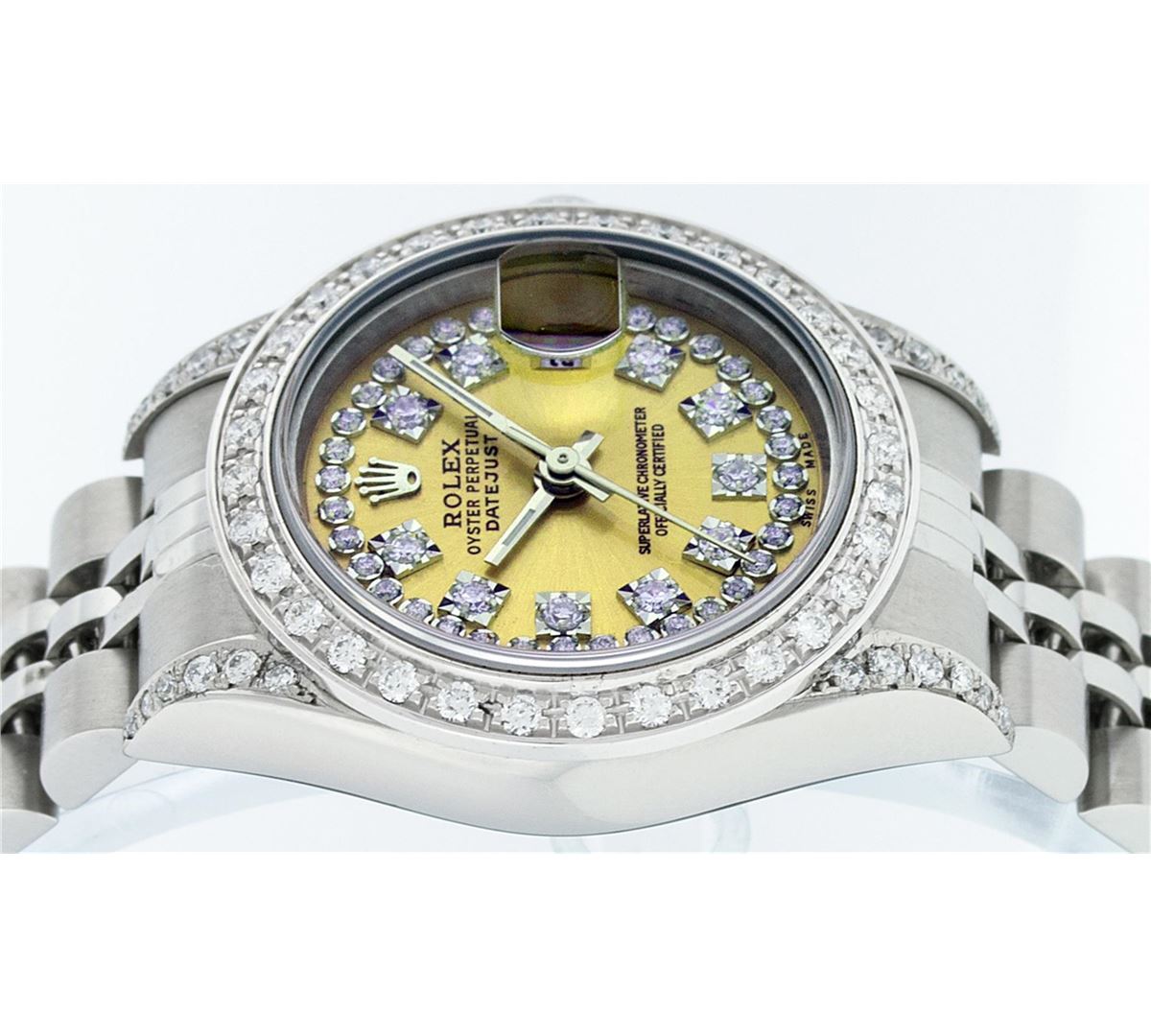 One Ladies Rolex Datejust Polished Bright with Satin Finish, Serviced & Electronically Tested, Stainless Steel Case:26mm, Stainless Steel Crown, Diamond Lugs: 16 Diamonds On Lugs, Clarity: SI-VS, Color: G to H. Custom Bezel: 18K White Gold Beadset Bezel, Diamond Count: 32 Diamonds, Total Weight 1.00 Carat, Clarity: SI-VS, Color: G to H. Custom Crystal: Synthetic Sapphire Cyclops Lens. Movement: Automatic Winding Movement Caliber 2235. Custom Dial: Refinished Yellow With String Diamond Dial VVS, 43 Diamonds in Dial G To H In Color, Clarity: VVS. Date Window: 3 O'clock Position Date Display, Model: No Hole Datejust Quickset. Condition: G-6 Extra Fine. Bracelet: Stainless Steel Jubilee Band. Bright Polish & Satin Finish. 6.0 Inch Length, Adjustable. Standard Clasp, With Rolex Logo. Comes with 6 month warranty.