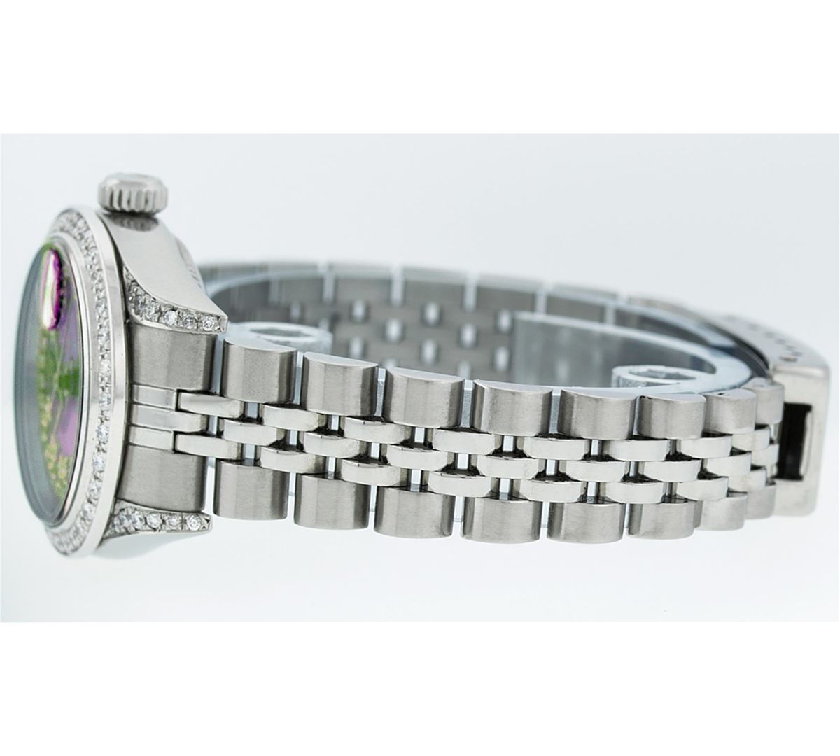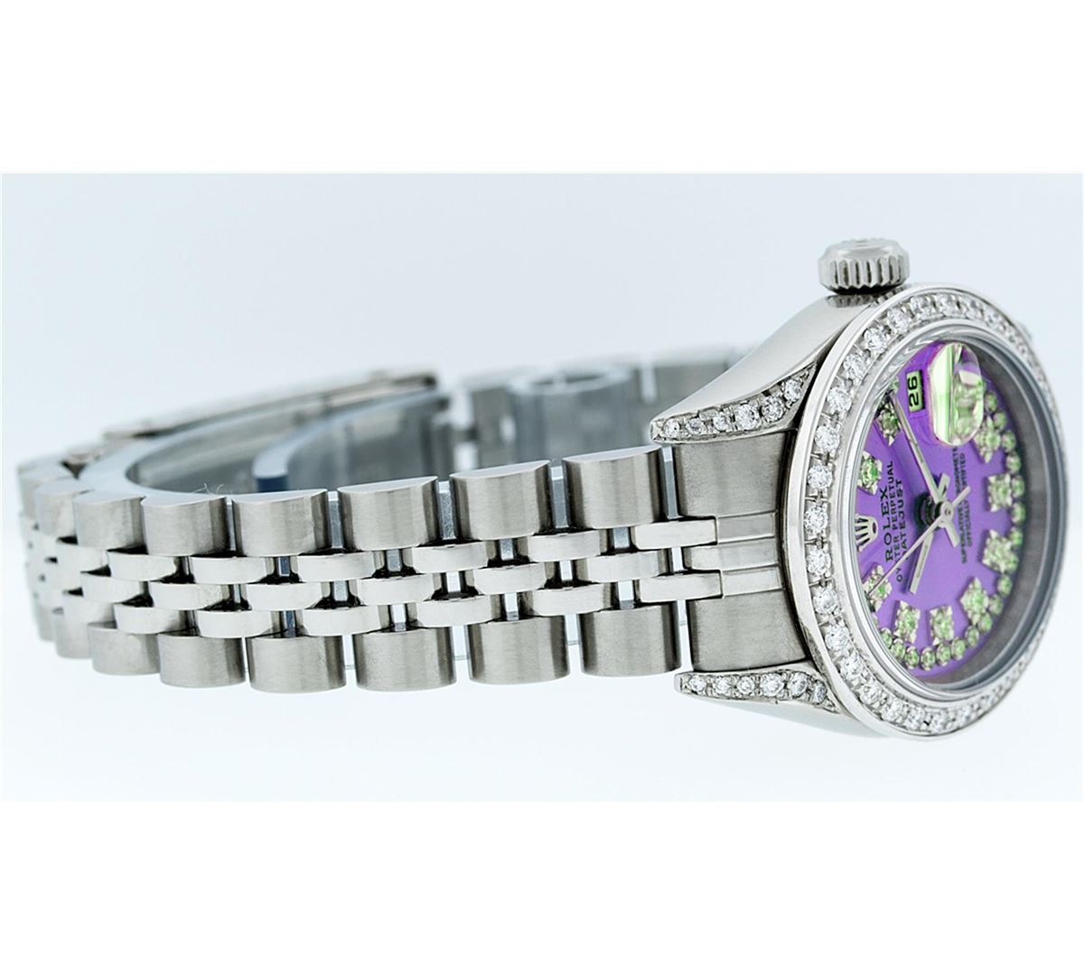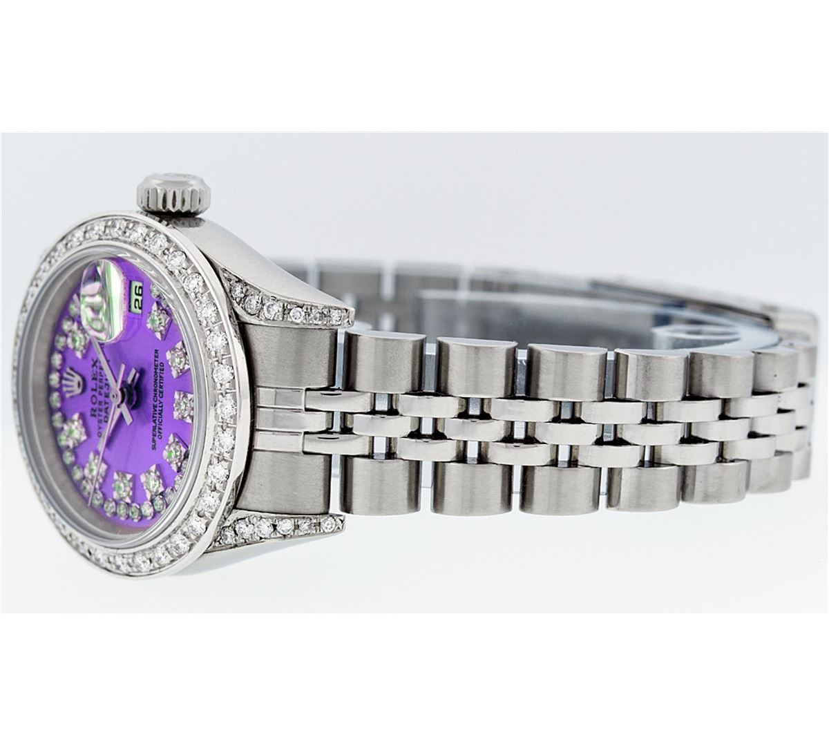 One Ladies Rolex Datejust Polished Bright with Satin Finish, Serviced & Electronically Tested, Stainless Steel Case:26mm, Stainless Steel Crown, Diamond Lugs: 16 Diamonds On Lugs, Clarity: SI-VS, Color: G to H. Custom Bezel: 18K White Gold Beadset Bezel, Diamond Count: 32 Diamonds, Total Weight 1.00 Carat, Clarity: SI-VS, Color: G to H. Custom Crystal: Synthetic Sapphire Cyclops Lens. Movement: Automatic Winding Movement Caliber 2235. Custom Dial: Refinished Purple With String Diamond Dial VVS, 43 Diamonds in Dial G To H In Color, Clarity: VVS. Date Window: 3 O'clock Position Date Display, Model: No Hole Quickset Datejust. Condition: G-6 Extra Fine. Bracelet: Stainless Steel Jubilee Band. Bright Polish & Satin Finish. 6.0 Inch Length, Adjustable. Standard Clasp, With Rolex Logo. Comes with 6 month warranty.