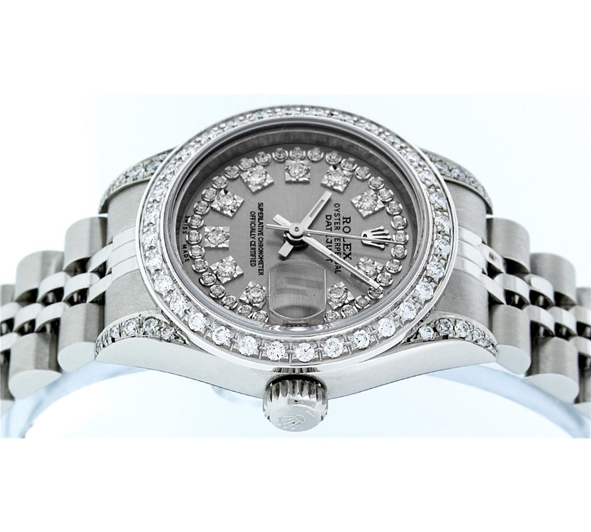 One Ladies Rolex Datejust Polished Bright with Satin Finish, Serviced & Electronically Tested, Stainless Steel Case:26mm, Stainless Steel Crown, Diamond Lugs: 16 Diamonds On Lugs, Clarity: SI-VS, Color: G to H. Custom Bezel: 18K White Gold Beadset Bezel, Diamond Count: 32 Diamonds, Total Weight 1.00 Carat, Clarity: SI-VS, Color: G to H. Custom Crystal: Synthetic Sapphire Cyclops Lens. Movement: Automatic Winding Movement Caliber 2235. Custom Dial: Refinished Slate Grey With String Diamond Dial VVS, 43 Diamonds in Dial G To H In Color, Clarity: VVS. Date Window: 3 O'clock Position Date Display, Model: No Hole Datejust Quickset. Condition: G-6 Extra Fine. Bracelet: Stainless Steel Jubilee Band. Bright Polish & Satin Finish. 6.0 Inch Length, Adjustable. Standard Clasp, With Rolex Logo. Comes with 6 month warranty.