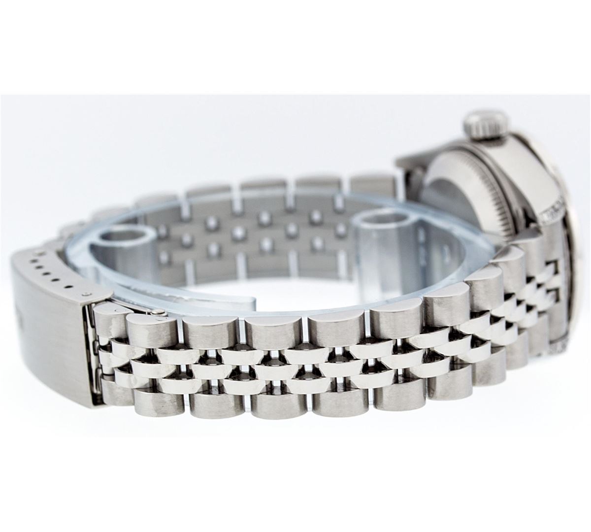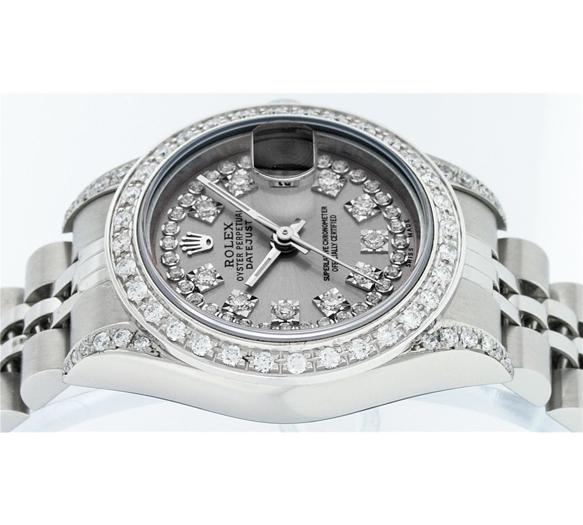 One Ladies Rolex Datejust Polished Bright with Satin Finish, Serviced & Electronically Tested, Stainless Steel Case:26mm, Stainless Steel Crown, Diamond Lugs: 16 Diamonds On Lugs, Clarity: SI-VS, Color: G to H. Custom Bezel: 18K White Gold Beadset Bezel, Diamond Count: 32 Diamonds, Total Weight 1.00 Carat, Clarity: SI-VS, Color: G to H. Custom Crystal: Synthetic Sapphire Cyclops Lens. Movement: Automatic Winding Movement Caliber 2235. Custom Dial: Refinished Slate Grey With String Diamond Dial VVS, 43 Diamonds in Dial G To H In Color, Clarity: VVS. Date Window: 3 O'clock Position Date Display, Model: No Hole Datejust Quickset. Condition: G-6 Extra Fine. Bracelet: Stainless Steel Jubilee Band. Bright Polish & Satin Finish. 6.0 Inch Length, Adjustable. Standard Clasp, With Rolex Logo. Comes with 6 month warranty.