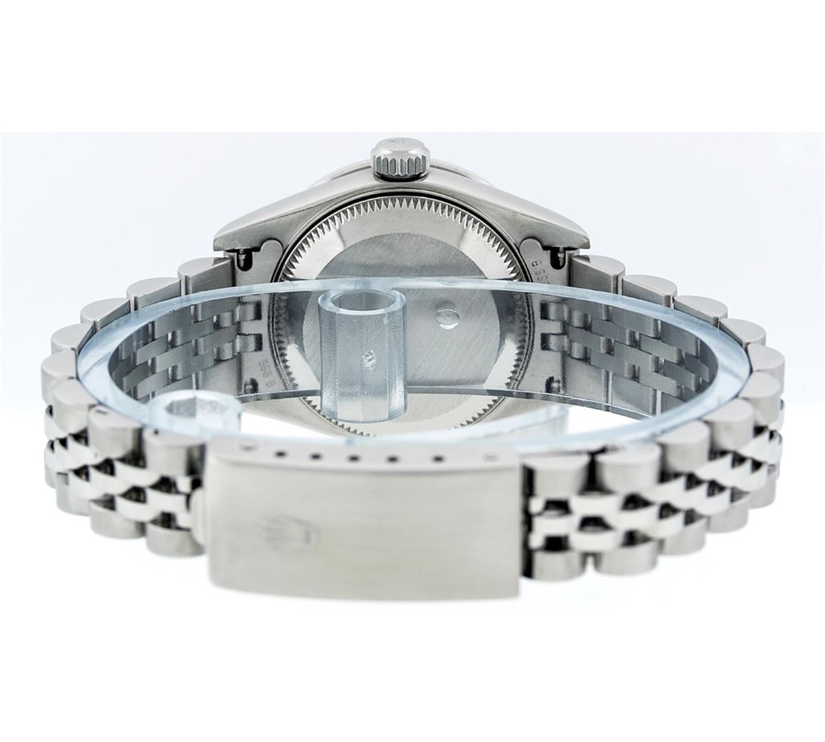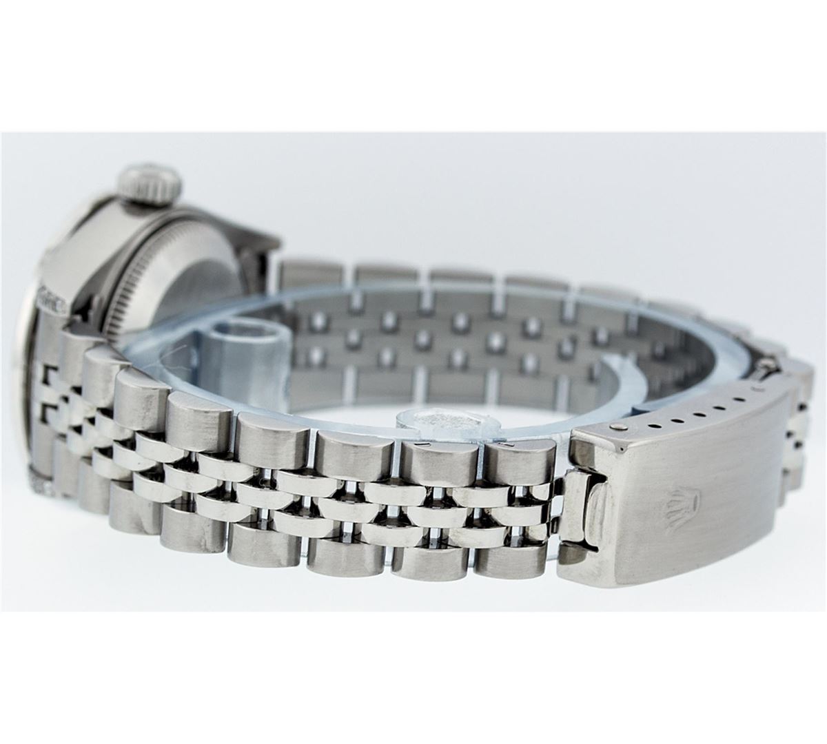 One Ladies Rolex Datejust Polished Bright with Satin Finish, Serviced & Electronically Tested, Stainless Steel Case:26mm, Stainless Steel Crown, Diamond Lugs: 16 Diamonds On Lugs, Clarity: SI-VS, Color: G to H. Custom Bezel: 18K White Gold Beadset Bezel, Diamond Count: 32 Diamonds, Total Weight 1.00 Carat, Clarity: SI-VS, Color: G to H. Custom Crystal: Synthetic Sapphire Cyclops Lens. Movement: Automatic Winding Movement Caliber 2235. Custom Dial: Refinished Sky Blue With String Diamond Dial VVS, 43 Diamonds in Dial G To H In Color, Clarity: VVS. Date Window: 3 O'clock Position Date Display, Model: No Hole Datejust Quickset. Condition: G-6 Extra Fine. Bracelet: Stainless Steel Jubilee Band. Bright Polish & Satin Finish. 6.0 Inch Length, Adjustable. Standard Clasp, With Rolex Logo. Comes with 6 month warranty.