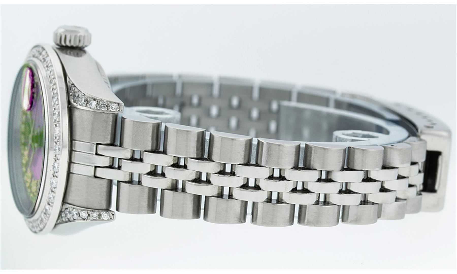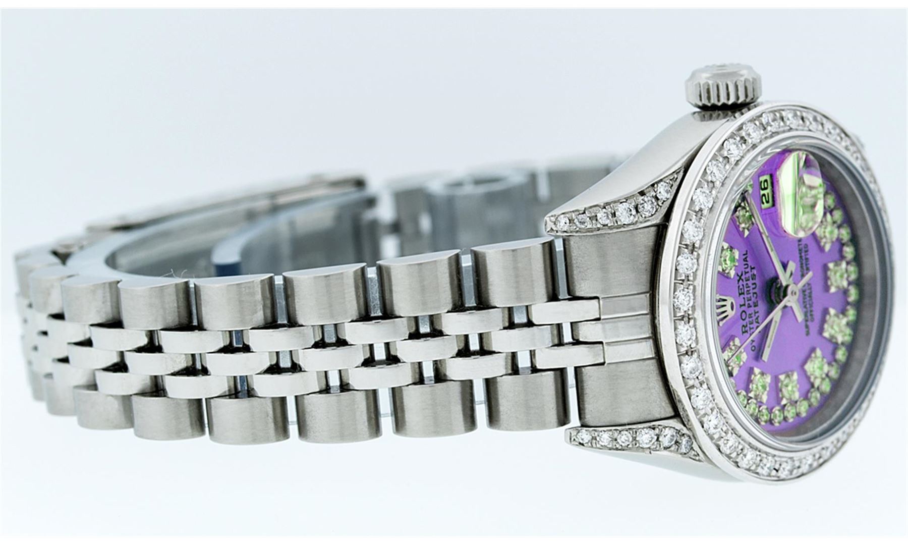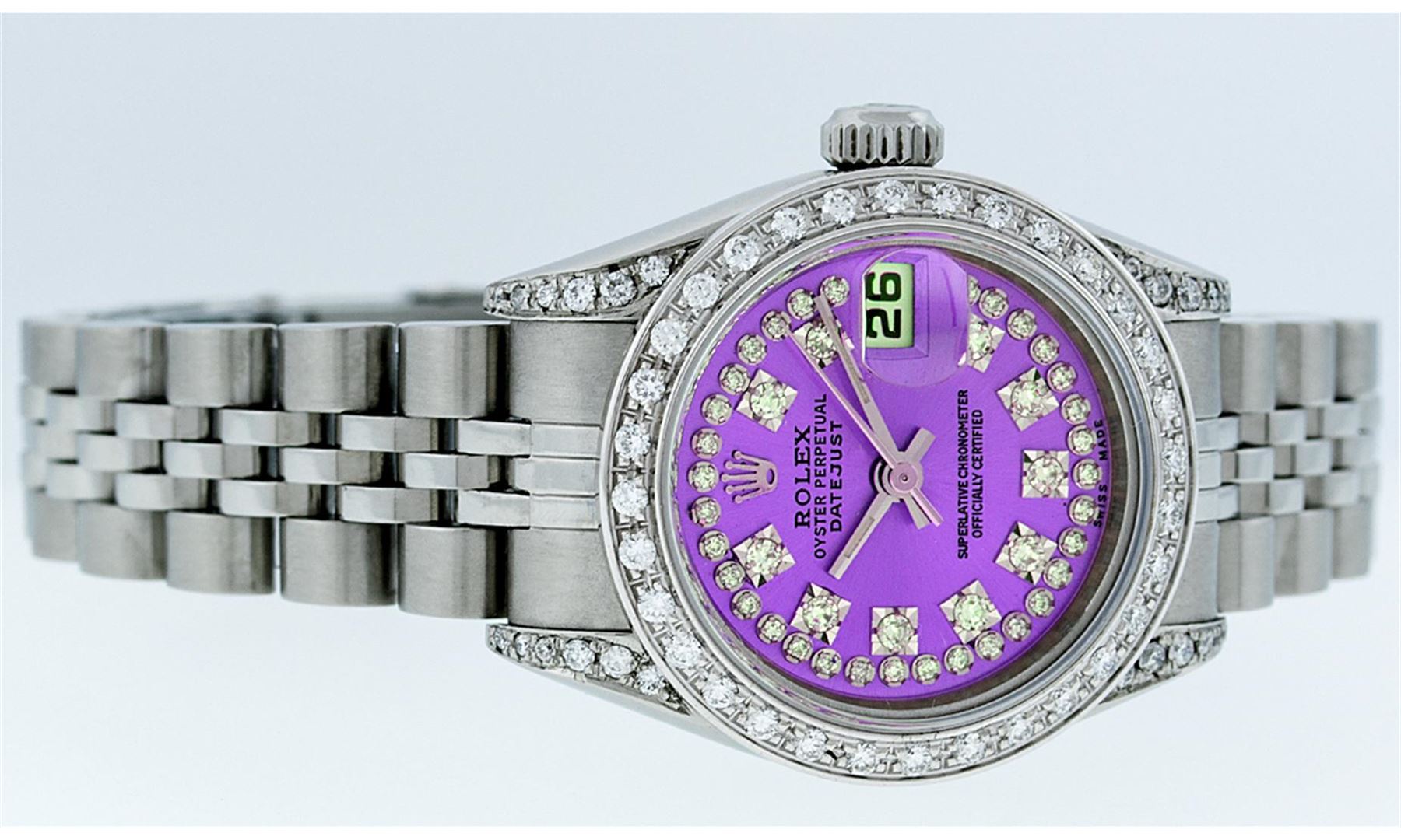 One Ladies Rolex Datejust Polished Bright with Satin Finish, Serviced & Electronically Tested, Stainless Steel Case:26mm, Stainless Steel Crown, Diamond Lugs: 16 Diamonds On Lugs, Clarity: SI-VS, Color: G to H. Custom Bezel: 18K White Gold Beadset Bezel, Diamond Count: 32 Diamonds, Total Weight 1.00 Carat, Clarity: SI-VS, Color: G to H. Custom Crystal: Synthetic Sapphire Cyclops Lens. Movement: Automatic Winding Movement Caliber 2235. Custom Dial: Refinished Purple With String Diamond Dial VVS, 43 Diamonds in Dial G To H In Color, Clarity: VVS. Date Window: 3 O'clock Position Date Display, Model: No Hole Quickset Datejust. Condition: G-6 Extra Fine. Bracelet: Stainless Steel Jubilee Band. Bright Polish & Satin Finish. 6.0 Inch Length, Adjustable. Standard Clasp, With Rolex Logo. Comes with 6 month warranty.