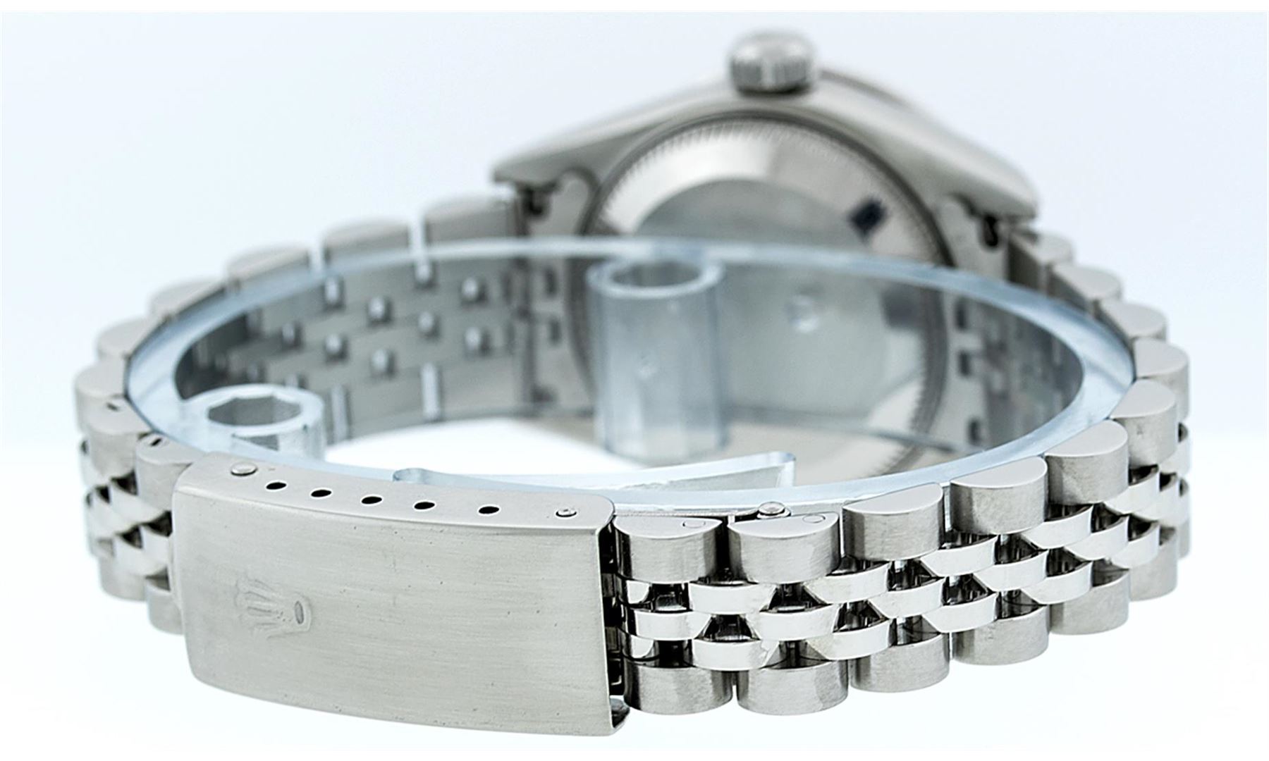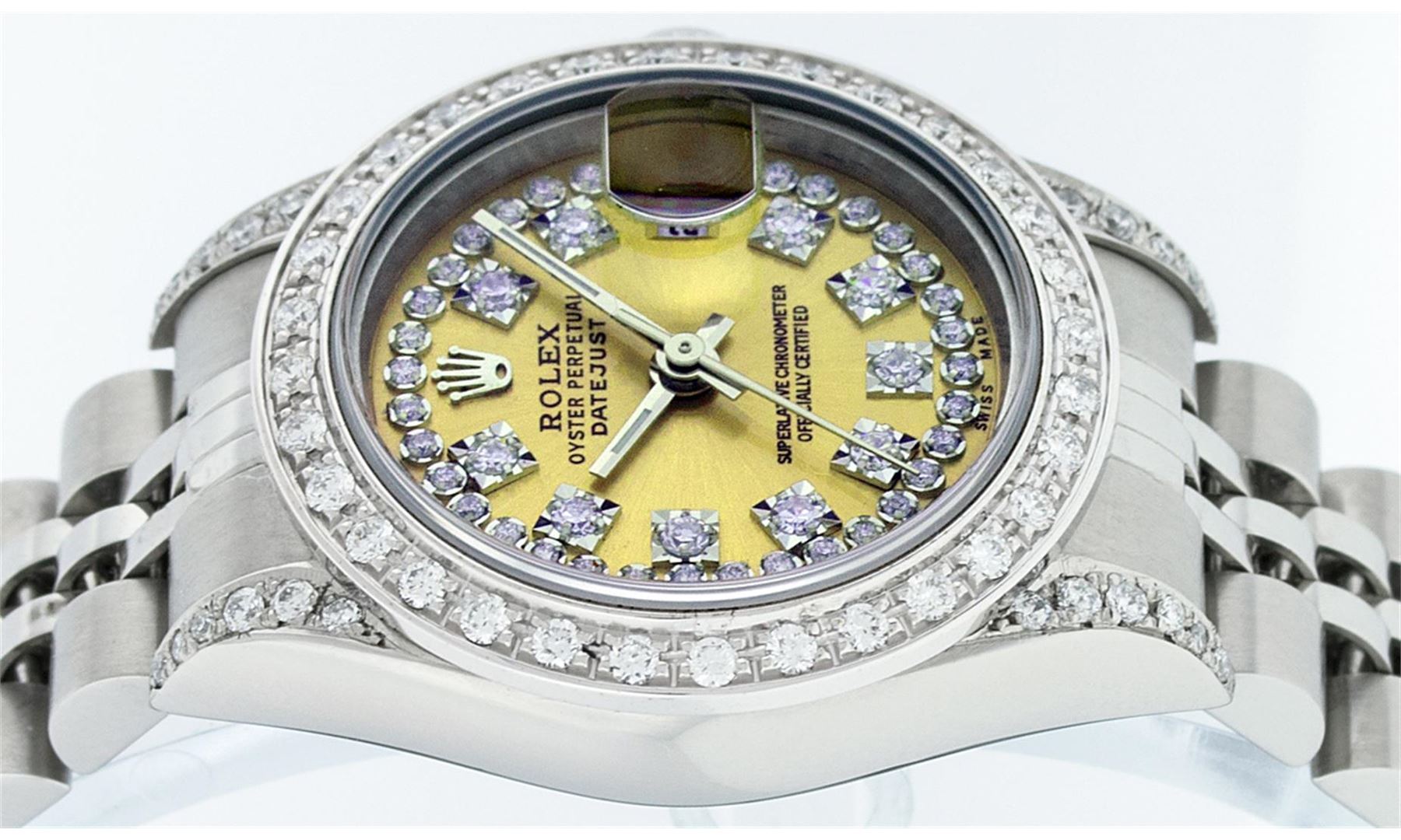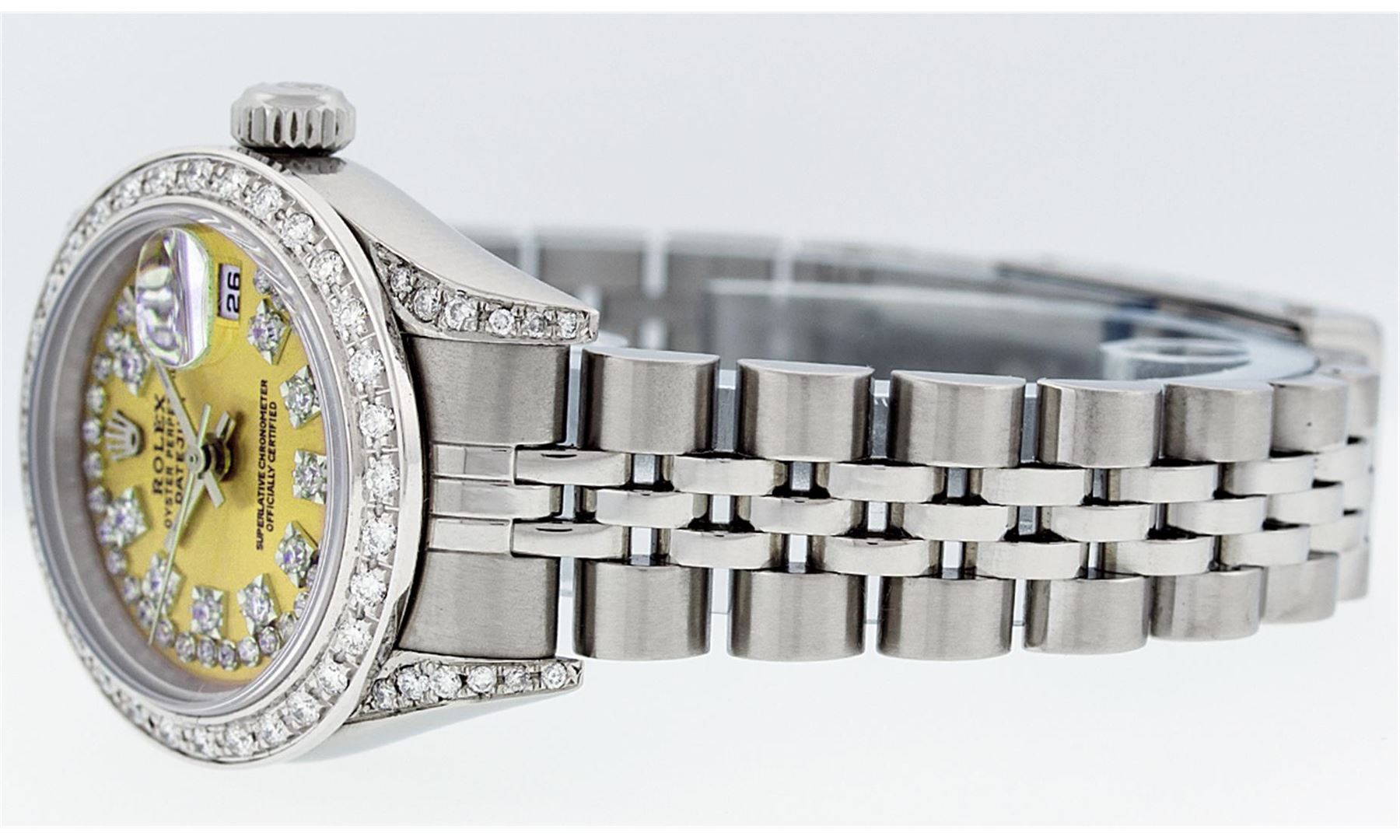 One Ladies Rolex Datejust Polished Bright with Satin Finish, Serviced & Electronically Tested, Stainless Steel Case:26mm, Stainless Steel Crown, Diamond Lugs: 16 Diamonds On Lugs, Clarity: SI-VS, Color: G to H. Custom Bezel: 18K White Gold Beadset Bezel, Diamond Count: 32 Diamonds, Total Weight 1.00 Carat, Clarity: SI-VS, Color: G to H. Custom Crystal: Synthetic Sapphire Cyclops Lens. Movement: Automatic Winding Movement Caliber 2235. Custom Dial: Refinished Yellow With String Diamond Dial VVS, 43 Diamonds in Dial G To H In Color, Clarity: VVS. Date Window: 3 O'clock Position Date Display, Model: No Hole Datejust Quickset. Condition: G-6 Extra Fine. Bracelet: Stainless Steel Jubilee Band. Bright Polish & Satin Finish. 6.0 Inch Length, Adjustable. Standard Clasp, With Rolex Logo. Comes with 6 month warranty.