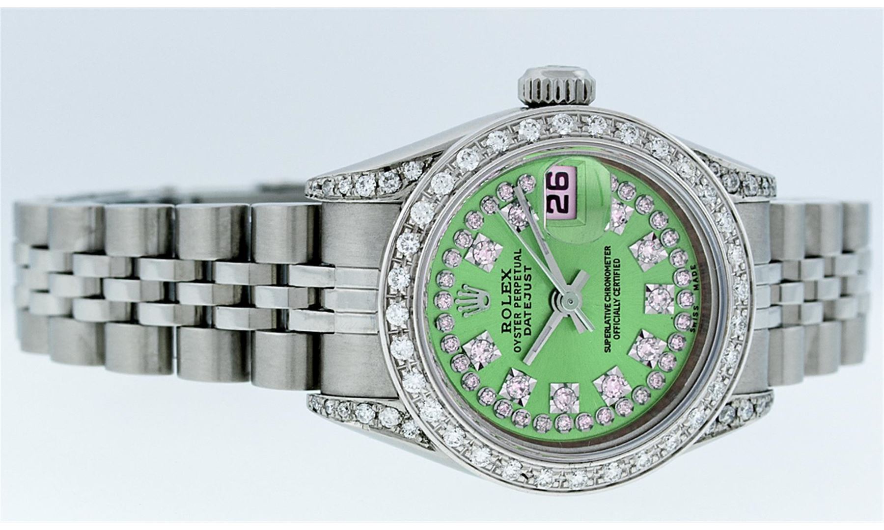 One Ladies Rolex Datejust Polished Bright with Satin Finish, Serviced & Electronically Tested, Stainless Steel Case:26mm, Stainless Steel Crown, Diamond Lugs: 16 Diamonds On Lugs, Clarity: SI-VS, Color: G to H. Custom Bezel: 18K White Gold Beadset Bezel, Diamond Count: 32 Diamonds, Total Weight 1.00 Carat, Clarity: SI-VS, Color: G to H. Custom Crystal: Synthetic Sapphire Cyclops Lens. Movement: Automatic Winding Movement Caliber 2235. Custom Dial: Refinished Green With String Diamond Dial VVS, 43 Diamonds in Dial G To H In Color, Clarity: VVS. Date Window: 3 O'clock Position Date Display, Model: No Hole Quickset Datejust. Condition: G-6 Extra Fine. Bracelet: Stainless Steel Jubilee Band. Bright Polish & Satin Finish. 6.0 Inch Length, Adjustable. Standard Clasp, With Rolex Logo. Comes with 6 month warranty.