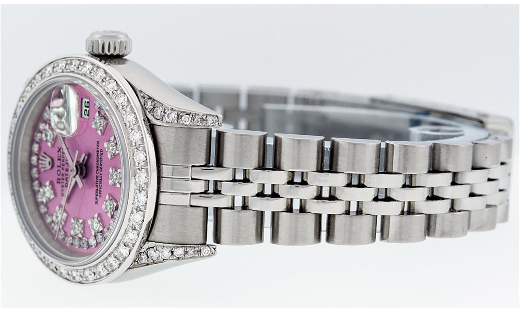 One Ladies Rolex Datejust Polished Bright with Satin Finish, Serviced & Electronically Tested, Stainless Steel Case:26mm, Stainless Steel Crown, Diamond Lugs: 16 Diamonds On Lugs, Clarity: SI-VS, Color: G to H. Custom Bezel: 18K White Gold Beadset Bezel, Diamond Count: 32 Diamonds, Total Weight 1.00 Carat, Clarity: SI-VS, Color: G to H. Custom Crystal: Synthetic Sapphire Cyclops Lens. Movement: Automatic Winding Movement Caliber 2235. Custom Dial: Refinished Pink With String Diamond Dial VVS, 43 Diamonds in Dial G To H In Color, Clarity: VVS. Date Window: 3 O'clock Position Date Display, Model: No Hole Quickset Datejust. Condition: G-6 Extra Fine. Bracelet: Stainless Steel Jubilee Band. Bright Polish & Satin Finish. 6.0 Inch Length, Adjustable. Standard Clasp, With Rolex Logo. Comes with 6 month warranty.