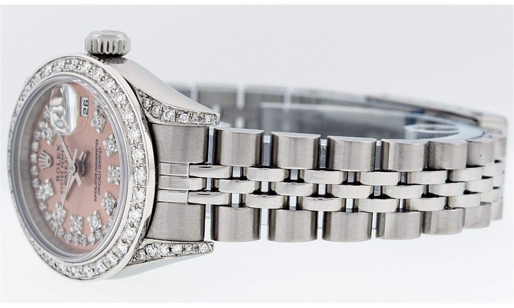 One Ladies Rolex Datejust Polished Bright with Satin Finish, Serviced & Electronically Tested, Stainless Steel Case:26mm, Stainless Steel Crown, Diamond Lugs: 16 Diamonds On Lugs, Clarity: SI-VS, Color: G to H. Custom Bezel: 18K White Gold Beadset Bezel, Diamond Count: 32 Diamonds, Total Weight 1.00 Carat, Clarity: SI-VS, Color: G to H. Custom Crystal: Synthetic Sapphire Cyclops Lens. Movement: Automatic Winding Movement Caliber 2235. Custom Dial: Refinished Salmon With String Diamond Dial VVS, 43 Diamonds in Dial G To H In Color, Clarity: VVS. Date Window: 3 O'clock Position Date Display, Model: No Hole Datejust Quickset. Condition: G-6 Extra Fine. Bracelet: Stainless Steel Jubilee Band. Bright Polish & Satin Finish. 6.0 Inch Length, Adjustable. Standard Clasp, With Rolex Logo. Comes with 6 month warranty.