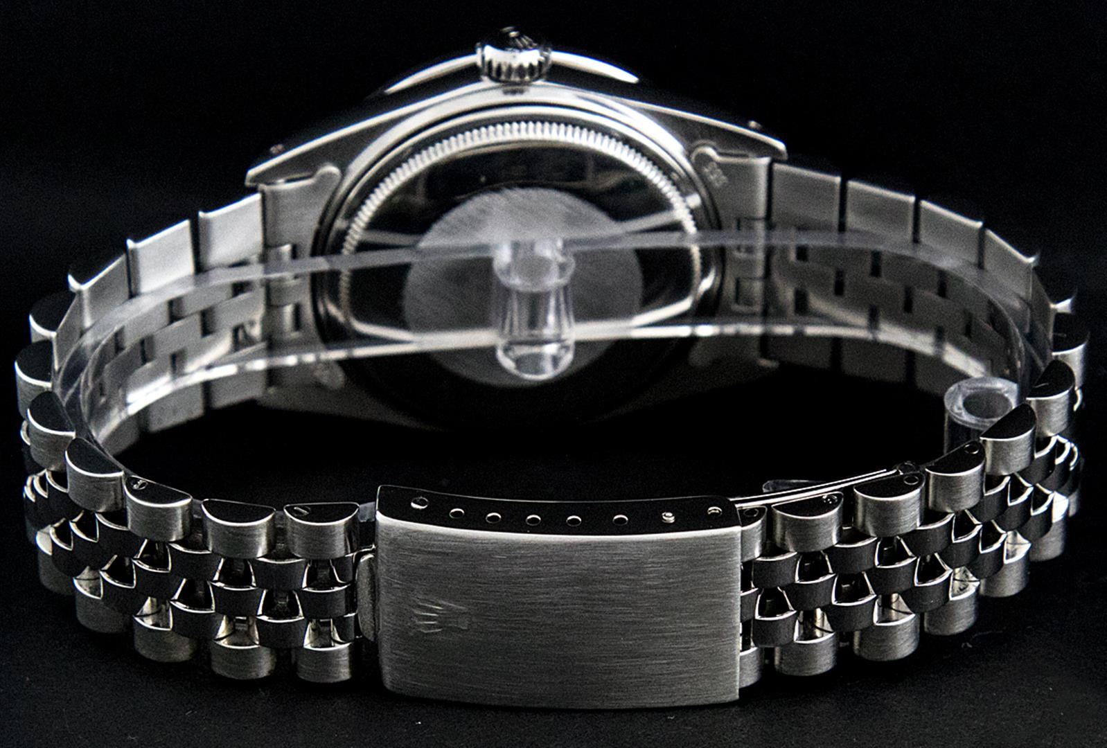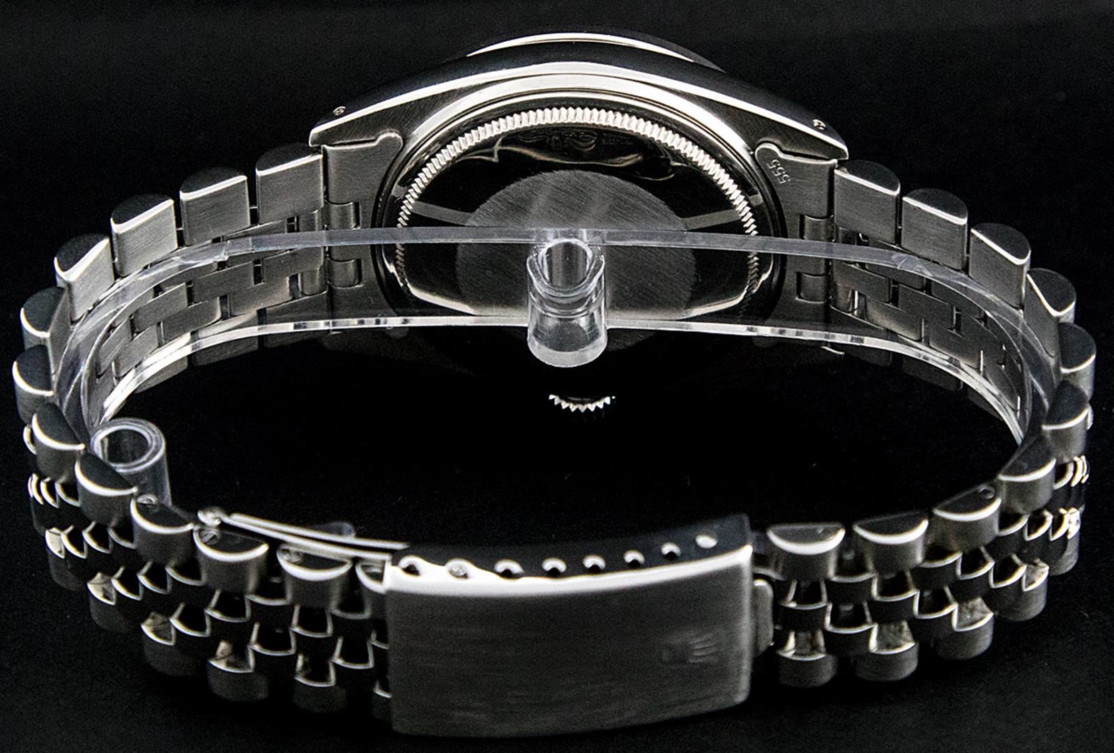 One Gents Rolex Datejust Polished, Serviced & Electronically Tested, Stainless Steel Case:36mm, Stainless Steel Crown, Custom Bezel: Stainless Steel Beadset Diamond Bezel, Diamond Count: 54 Diamonds. Total Weight .90 Carat, Clarity: SI-VS, Color: G to H. Custom Crystal: Synthetic Sapphire Cyclops Lens. Movement: Automatic Winding Movement Caliber 3035. Custom Dial: Black String Diamond Dial, Diamond Count: 58 Diamond In Dial G To H In Color, Clarity: VVS. Date Window: 3 O'Clock Position Date Display, Quickset, Model: 16014 Condition: G-6 Extra Fine. Bracelet: Stainless Steel Jubilee. Bright Polish & Satin Finish. 7.0 Inch Length, Adjustable. Standard Clasp, With Rolex Logo.