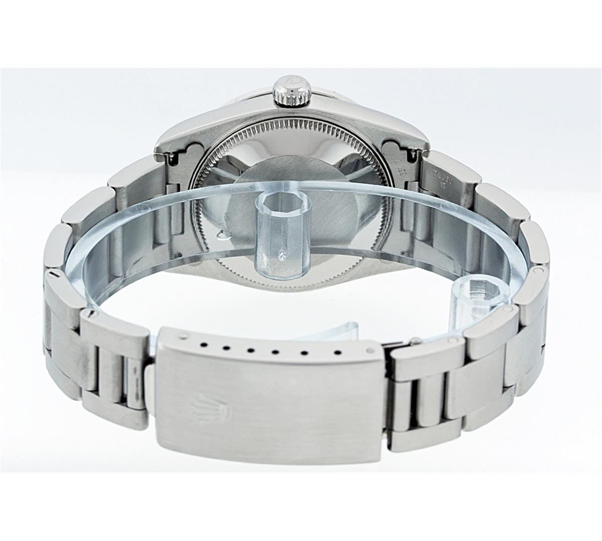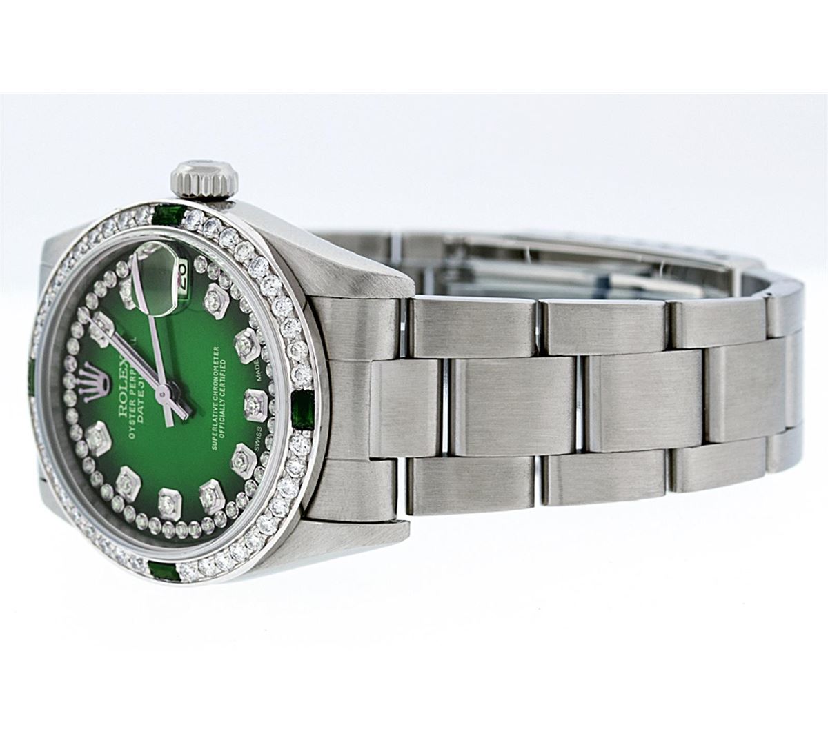 One Midsize Rolex Datejust Polished Bright with Satin Finish, Serviced & Electronically Tested, Stainless Steel Case:31mm, Stainless Steel Crown, Custom Bezel: 18K White Gold Beadset Emerald Beadset Bezel, Diamond Count: 4 Emeralds + 28 Diamonds, Total Weight .70 Carat, Clarity: SI-VS, Color: G to H. Custom Crystal: Synthetic Sapphire Cyclops Lens. Movement: Automatic Winding Movement Caliber 2235. Custom Dial: Refinished Green Vignette String Diamond Dial VVS, 43 Diamonds in Dial G To H In Color, Clarity: VVS. Date Window: 3 O'clock Position Date Display, Model: No Hole Datejust Quickset. Condition: G-6 Extra Fine. Bracelet: Stainless Steel Oyster Band. Bright Polish & Satin Finish. 6.0 Inch Length, Adjustable. Standard Clasp, With Rolex Logo. Comes with 6 month warranty.