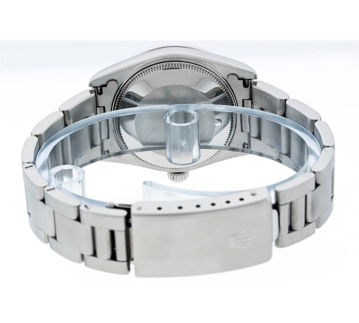 One Midsize Rolex Datejust Polished Bright with Satin Finish, Serviced & Electronically Tested, Stainless Steel Case:31mm, Stainless Steel Crown, Custom Bezel: 18K White Gold Beadset Emerald Beadset Bezel, Diamond Count: 4 Emeralds + 28 Diamonds, Total Weight .70 Carat, Clarity: SI-VS, Color: G to H. Custom Crystal: Synthetic Sapphire Cyclops Lens. Movement: Automatic Winding Movement Caliber 2235. Custom Dial: Refinished Green Vignette String Diamond Dial VVS, 43 Diamonds in Dial G To H In Color, Clarity: VVS. Date Window: 3 O'clock Position Date Display, Model: No Hole Datejust Quickset. Condition: G-6 Extra Fine. Bracelet: Stainless Steel Oyster Band. Bright Polish & Satin Finish. 6.0 Inch Length, Adjustable. Standard Clasp, With Rolex Logo. Comes with 6 month warranty.