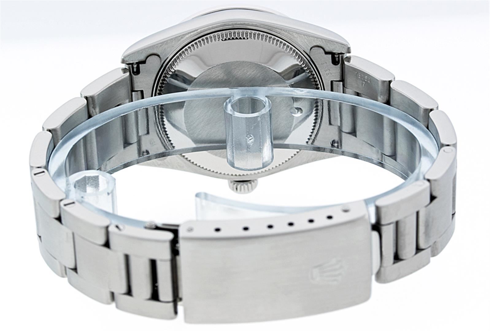 One Midsize Rolex Datejust Polished Bright with Satin Finish, Serviced & Electronically Tested, Stainless Steel Case:31mm, Stainless Steel Crown, Custom Bezel: 18K White Gold Beadset Emerald Beadset Bezel, Diamond Count: 4 Emeralds + 28 Diamonds, Total Weight .70 Carat, Clarity: SI-VS, Color: G to H. Custom Crystal: Synthetic Sapphire Cyclops Lens. Movement: Automatic Winding Movement Caliber 2235. Custom Dial: Refinished Black String Diamond Dial VVS, 43 Diamonds in Dial G To H In Color, Clarity: VVS. Date Window: 3 O'clock Position Date Display, Model: No Hole Datejust Quickset. Condition: G-6 Extra Fine. Bracelet: Stainless Steel Oyster Band. Bright Polish & Satin Finish. 6.0 Inch Length, Adjustable. Standard Clasp, With Rolex Logo. Comes with 6 month warranty.
