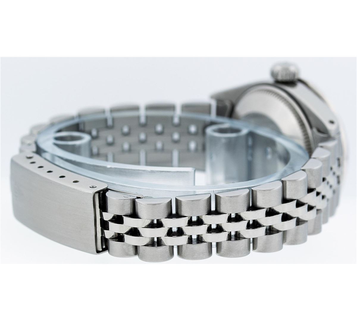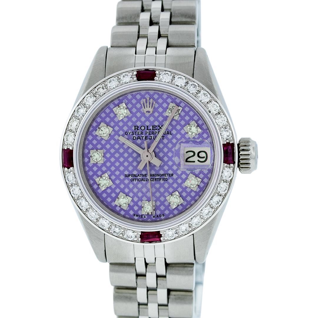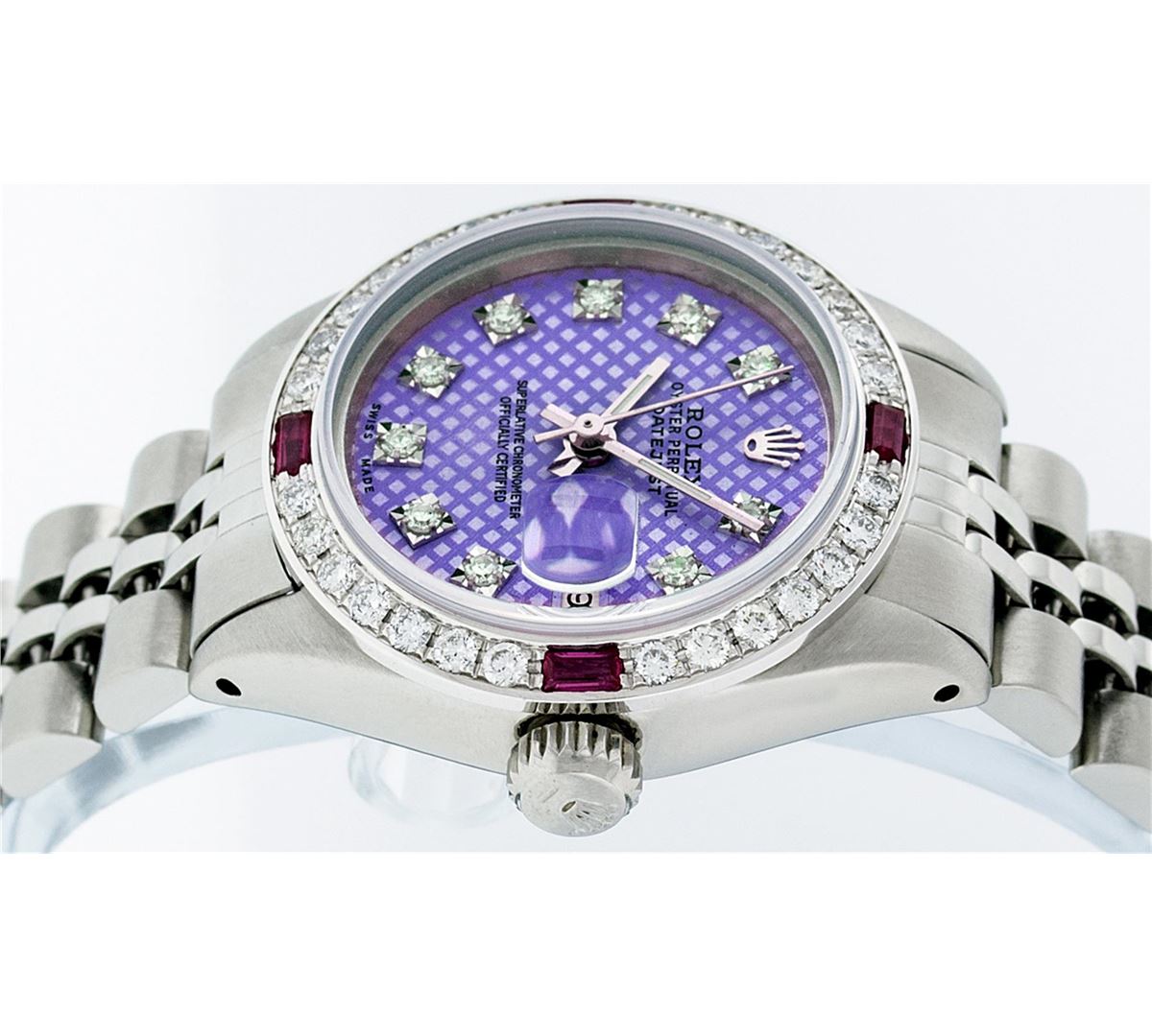 Ladies Rolex Datejust Polished Bright with Satin Finish, Serviced & Electronically Tested, Stainless Steel Case:26mm, Stainless Steel Crown, Custom Bezel: 18K White Gold Ruby Beadset Diamond Bezel, Diamond + Gem Count: 28 Diamonds + 4 Rubies. Total Weight .70 Carat, Clarity: SI-VS, Color: G to H. Custom Crystal: Synthetic Sapphire Cyclops Lens. Movement: Automatic Winding Movement Caliber 2030. Custom Dial: Refinished Purple With VVS Diamond Hour Markers. Diamond Count: 10 Diamonds, Color: G To H, Clarity: VVS. Date Window: 3 O'clock Position Date Display, Model: Datejust. Condition: G-6 Extra Fine. Bracelet: Stainless Steel Jubilee. Bright Polish & Satin Finish. 6.0 Inch Length, Adjustable. Standard Clasp, With Rolex Logo. Comes with 6 month warranty.