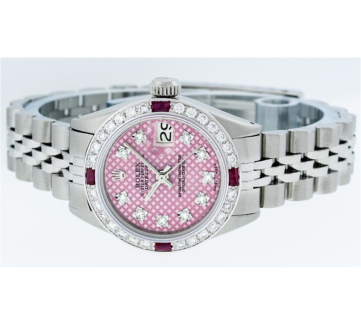 Ladies Rolex Datejust Polished Bright with Satin Finish, Serviced & Electronically Tested, Stainless Steel Case:26mm, Stainless Steel Crown, Custom Bezel: 18K White Gold Ruby Beadset Diamond Bezel, Diamond + Gem Count: 28 Diamonds + 4 Rubies. Total Weight .70 Carat, Clarity: SI-VS, Color: G to H. Custom Crystal: Synthetic Sapphire Cyclops Lens. Movement: Automatic Winding Movement Caliber 2030. Custom Dial: Refinished Pink With VVS Diamond Hour Markers. Diamond Count: 10 Diamonds, Color: G To H, Clarity: VVS. Date Window: 3 O'clock Position Date Display, Model: Datejust. Condition: G-6 Extra Fine. Bracelet: Stainless Steel Jubilee. Bright Polish & Satin Finish. 6.0 Inch Length, Adjustable. Standard Clasp, With Rolex Logo. Comes with 6 month warranty.