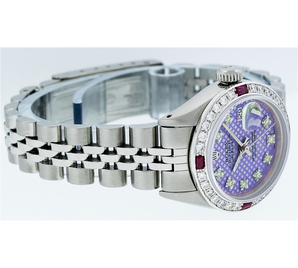 Ladies Rolex Datejust Polished Bright with Satin Finish, Serviced & Electronically Tested, Stainless Steel Case:26mm, Stainless Steel Crown, Custom Bezel: 18K White Gold Ruby Beadset Diamond Bezel, Diamond + Gem Count: 28 Diamonds + 4 Rubies. Total Weight .70 Carat, Clarity: SI-VS, Color: G to H. Custom Crystal: Synthetic Sapphire Cyclops Lens. Movement: Automatic Winding Movement Caliber 2030. Custom Dial: Refinished Purple With VVS Diamond Hour Markers. Diamond Count: 10 Diamonds, Color: G To H, Clarity: VVS. Date Window: 3 O'clock Position Date Display, Model: Datejust. Condition: G-6 Extra Fine. Bracelet: Stainless Steel Jubilee. Bright Polish & Satin Finish. 6.0 Inch Length, Adjustable. Standard Clasp, With Rolex Logo. Comes with 6 month warranty.