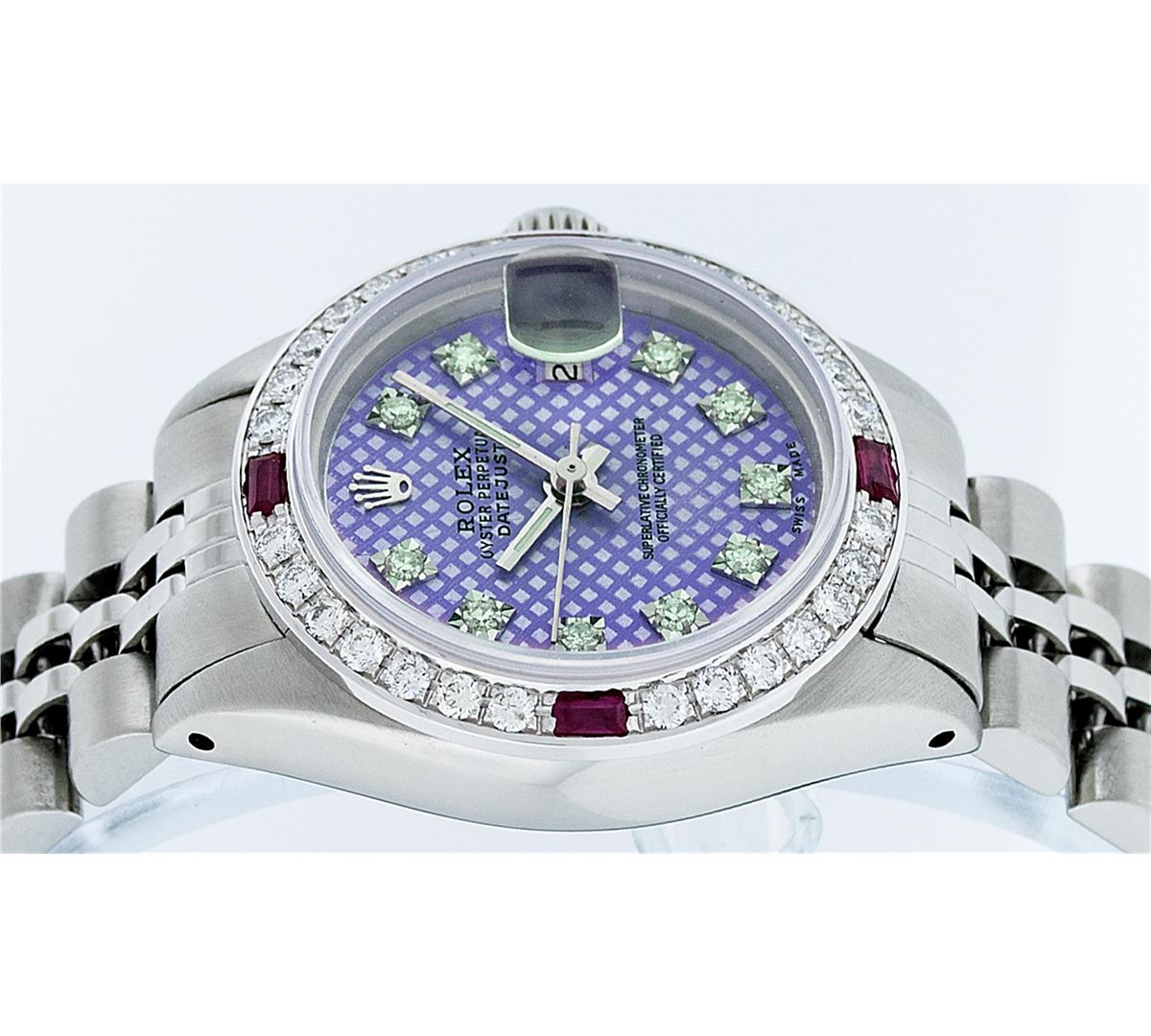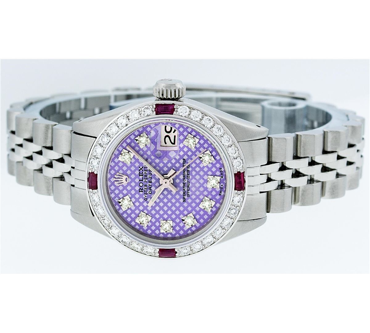 Ladies Rolex Datejust Polished Bright with Satin Finish, Serviced & Electronically Tested, Stainless Steel Case:26mm, Stainless Steel Crown, Custom Bezel: 18K White Gold Ruby Beadset Diamond Bezel, Diamond + Gem Count: 28 Diamonds + 4 Rubies. Total Weight .70 Carat, Clarity: SI-VS, Color: G to H. Custom Crystal: Synthetic Sapphire Cyclops Lens. Movement: Automatic Winding Movement Caliber 2030. Custom Dial: Refinished Purple With VVS Diamond Hour Markers. Diamond Count: 10 Diamonds, Color: G To H, Clarity: VVS. Date Window: 3 O'clock Position Date Display, Model: Datejust. Condition: G-6 Extra Fine. Bracelet: Stainless Steel Jubilee. Bright Polish & Satin Finish. 6.0 Inch Length, Adjustable. Standard Clasp, With Rolex Logo. Comes with 6 month warranty.
