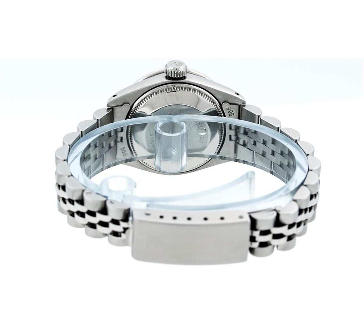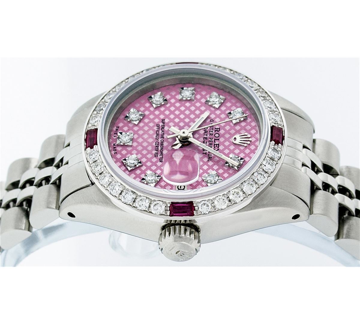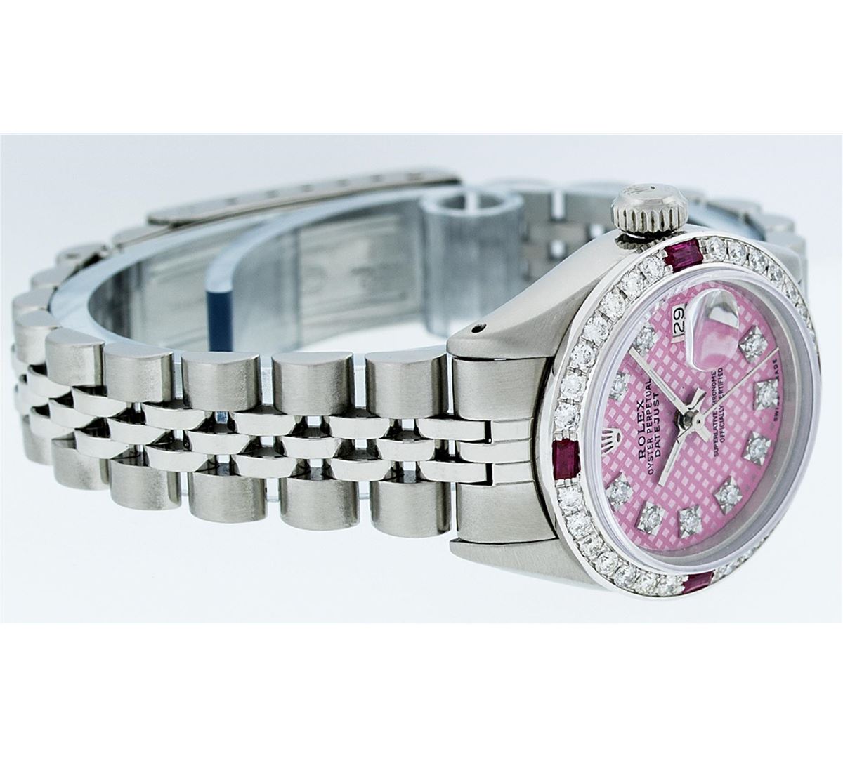 Ladies Rolex Datejust Polished Bright with Satin Finish, Serviced & Electronically Tested, Stainless Steel Case:26mm, Stainless Steel Crown, Custom Bezel: 18K White Gold Ruby Beadset Diamond Bezel, Diamond + Gem Count: 28 Diamonds + 4 Rubies. Total Weight .70 Carat, Clarity: SI-VS, Color: G to H. Custom Crystal: Synthetic Sapphire Cyclops Lens. Movement: Automatic Winding Movement Caliber 2030. Custom Dial: Refinished Pink With VVS Diamond Hour Markers. Diamond Count: 10 Diamonds, Color: G To H, Clarity: VVS. Date Window: 3 O'clock Position Date Display, Model: Datejust. Condition: G-6 Extra Fine. Bracelet: Stainless Steel Jubilee. Bright Polish & Satin Finish. 6.0 Inch Length, Adjustable. Standard Clasp, With Rolex Logo. Comes with 6 month warranty.