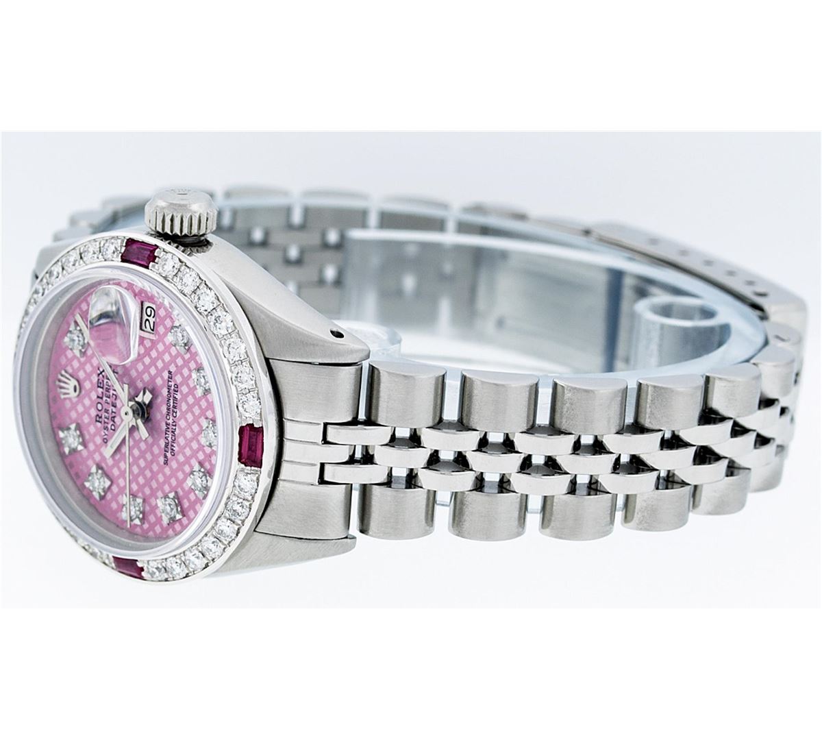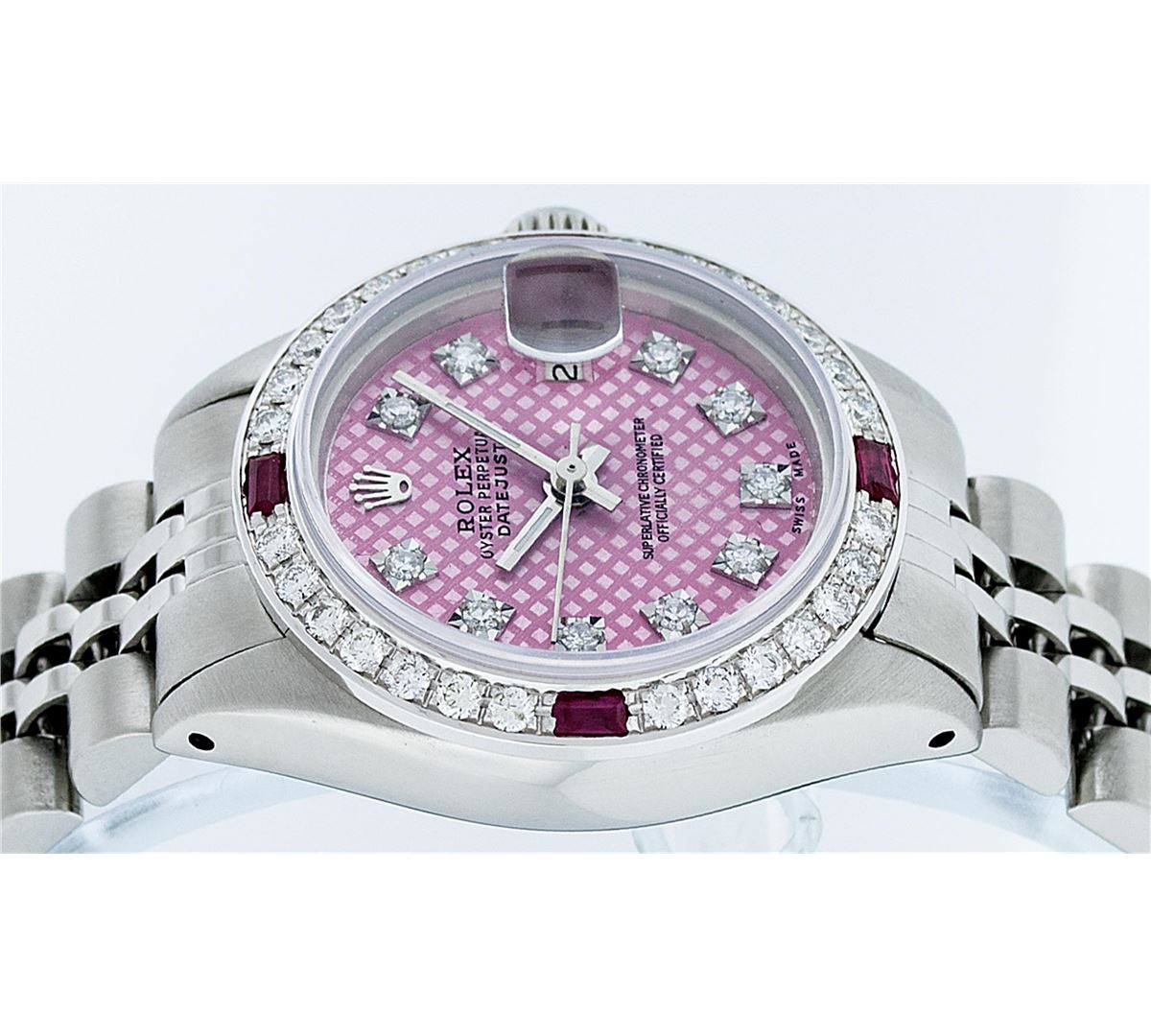 Ladies Rolex Datejust Polished Bright with Satin Finish, Serviced & Electronically Tested, Stainless Steel Case:26mm, Stainless Steel Crown, Custom Bezel: 18K White Gold Ruby Beadset Diamond Bezel, Diamond + Gem Count: 28 Diamonds + 4 Rubies. Total Weight .70 Carat, Clarity: SI-VS, Color: G to H. Custom Crystal: Synthetic Sapphire Cyclops Lens. Movement: Automatic Winding Movement Caliber 2030. Custom Dial: Refinished Pink With VVS Diamond Hour Markers. Diamond Count: 10 Diamonds, Color: G To H, Clarity: VVS. Date Window: 3 O'clock Position Date Display, Model: Datejust. Condition: G-6 Extra Fine. Bracelet: Stainless Steel Jubilee. Bright Polish & Satin Finish. 6.0 Inch Length, Adjustable. Standard Clasp, With Rolex Logo. Comes with 6 month warranty.