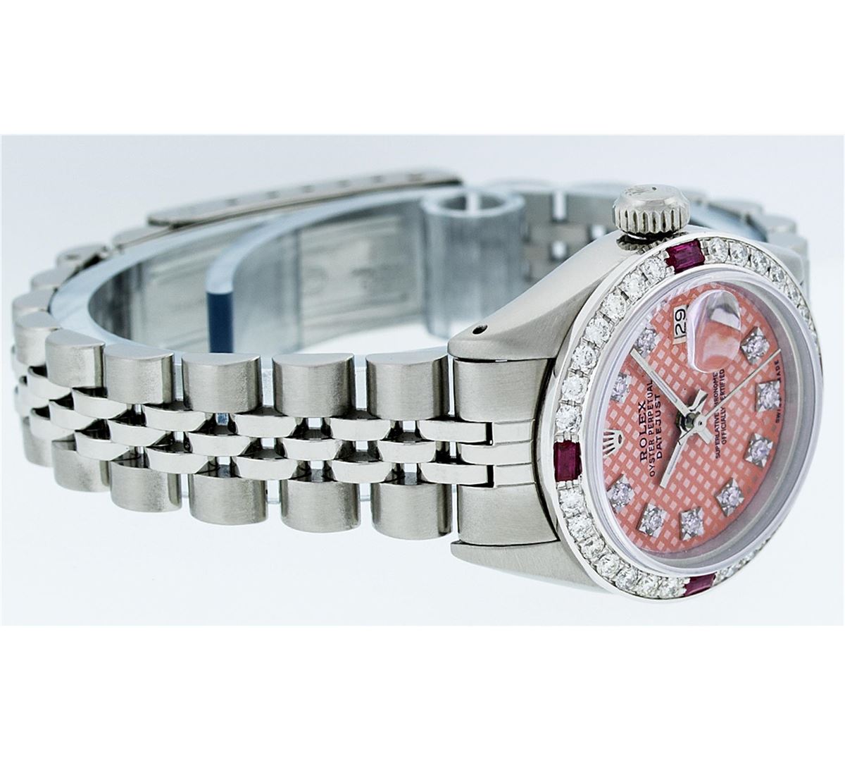 Ladies Rolex Datejust Polished Bright with Satin Finish, Serviced & Electronically Tested, Stainless Steel Case:26mm, Stainless Steel Crown, Custom Bezel: 18K White Gold Ruby Beadset Diamond Bezel, Diamond + Gem Count: 28 Diamonds + 4 Rubies. Total Weight .70 Carat, Clarity: SI-VS, Color: G to H. Custom Crystal: Synthetic Sapphire Cyclops Lens. Movement: Automatic Winding Movement Caliber 2030. Custom Dial: Refinished Salmon With VVS Diamond Hour Markers. Diamond Count: 10 Diamonds, Color: G To H, Clarity: VVS. Date Window: 3 O'clock Position Date Display, Model: Datejust. Condition: G-6 Extra Fine. Bracelet: Stainless Steel Jubilee. Bright Polish & Satin Finish. 6.0 Inch Length, Adjustable. Standard Clasp, With Rolex Logo. Comes with 6 month warranty.