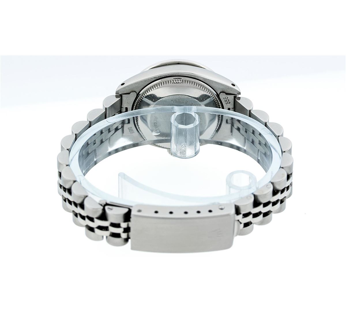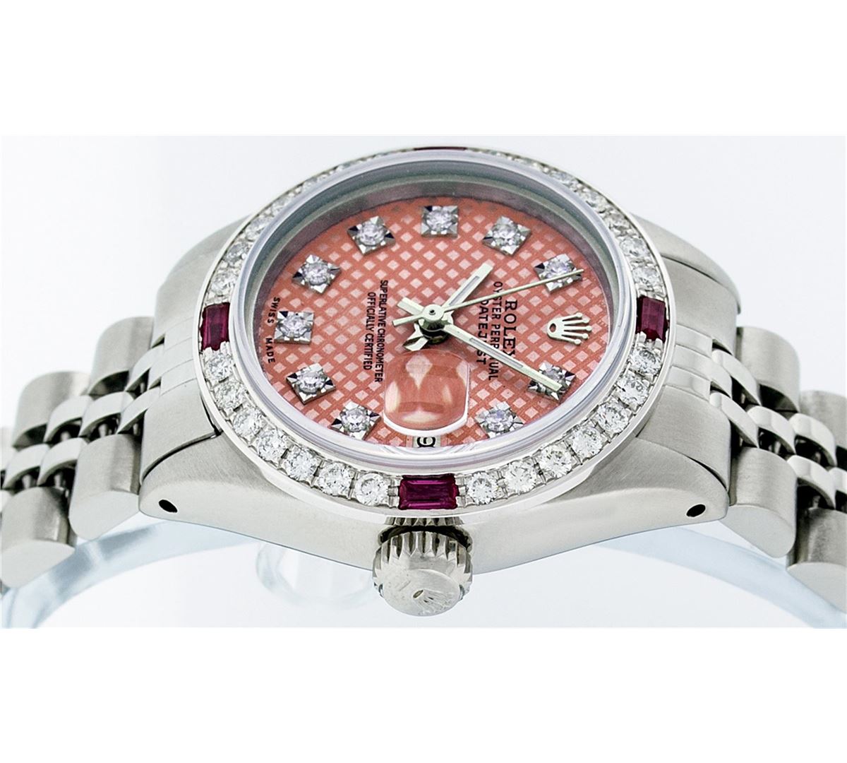 Ladies Rolex Datejust Polished Bright with Satin Finish, Serviced & Electronically Tested, Stainless Steel Case:26mm, Stainless Steel Crown, Custom Bezel: 18K White Gold Ruby Beadset Diamond Bezel, Diamond + Gem Count: 28 Diamonds + 4 Rubies. Total Weight .70 Carat, Clarity: SI-VS, Color: G to H. Custom Crystal: Synthetic Sapphire Cyclops Lens. Movement: Automatic Winding Movement Caliber 2030. Custom Dial: Refinished Salmon With VVS Diamond Hour Markers. Diamond Count: 10 Diamonds, Color: G To H, Clarity: VVS. Date Window: 3 O'clock Position Date Display, Model: Datejust. Condition: G-6 Extra Fine. Bracelet: Stainless Steel Jubilee. Bright Polish & Satin Finish. 6.0 Inch Length, Adjustable. Standard Clasp, With Rolex Logo. Comes with 6 month warranty.