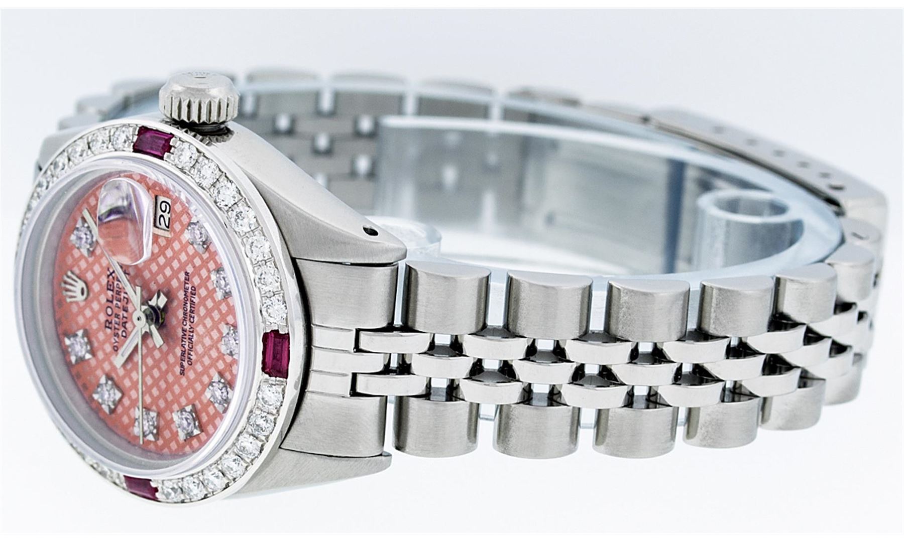 Ladies Rolex Datejust Polished Bright with Satin Finish, Serviced & Electronically Tested, Stainless Steel Case:26mm, Stainless Steel Crown, Custom Bezel: 18K White Gold Ruby Beadset Diamond Bezel, Diamond + Gem Count: 28 Diamonds + 4 Rubies. Total Weight .70 Carat, Clarity: SI-VS, Color: G to H. Custom Crystal: Synthetic Sapphire Cyclops Lens. Movement: Automatic Winding Movement Caliber 2030. Custom Dial: Refinished Salmon With VVS Diamond Hour Markers. Diamond Count: 10 Diamonds, Color: G To H, Clarity: VVS. Date Window: 3 O'clock Position Date Display, Model: Datejust. Condition: G-6 Extra Fine. Bracelet: Stainless Steel Jubilee. Bright Polish & Satin Finish. 6.0 Inch Length, Adjustable. Standard Clasp, With Rolex Logo. Comes with 6 month warranty.