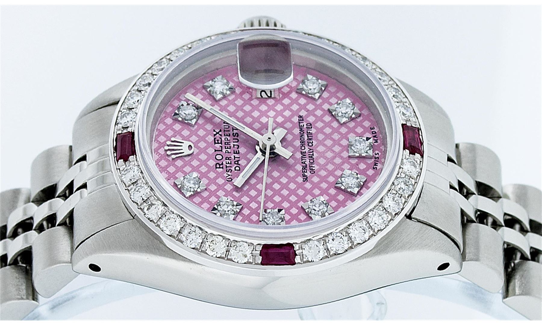 Ladies Rolex Datejust Polished Bright with Satin Finish, Serviced & Electronically Tested, Stainless Steel Case:26mm, Stainless Steel Crown, Custom Bezel: 18K White Gold Ruby Beadset Diamond Bezel, Diamond + Gem Count: 28 Diamonds + 4 Rubies. Total Weight .70 Carat, Clarity: SI-VS, Color: G to H. Custom Crystal: Synthetic Sapphire Cyclops Lens. Movement: Automatic Winding Movement Caliber 2030. Custom Dial: Refinished Pink With VVS Diamond Hour Markers. Diamond Count: 10 Diamonds, Color: G To H, Clarity: VVS. Date Window: 3 O'clock Position Date Display, Model: Datejust. Condition: G-6 Extra Fine. Bracelet: Stainless Steel Jubilee. Bright Polish & Satin Finish. 6.0 Inch Length, Adjustable. Standard Clasp, With Rolex Logo. Comes with 6 month warranty.