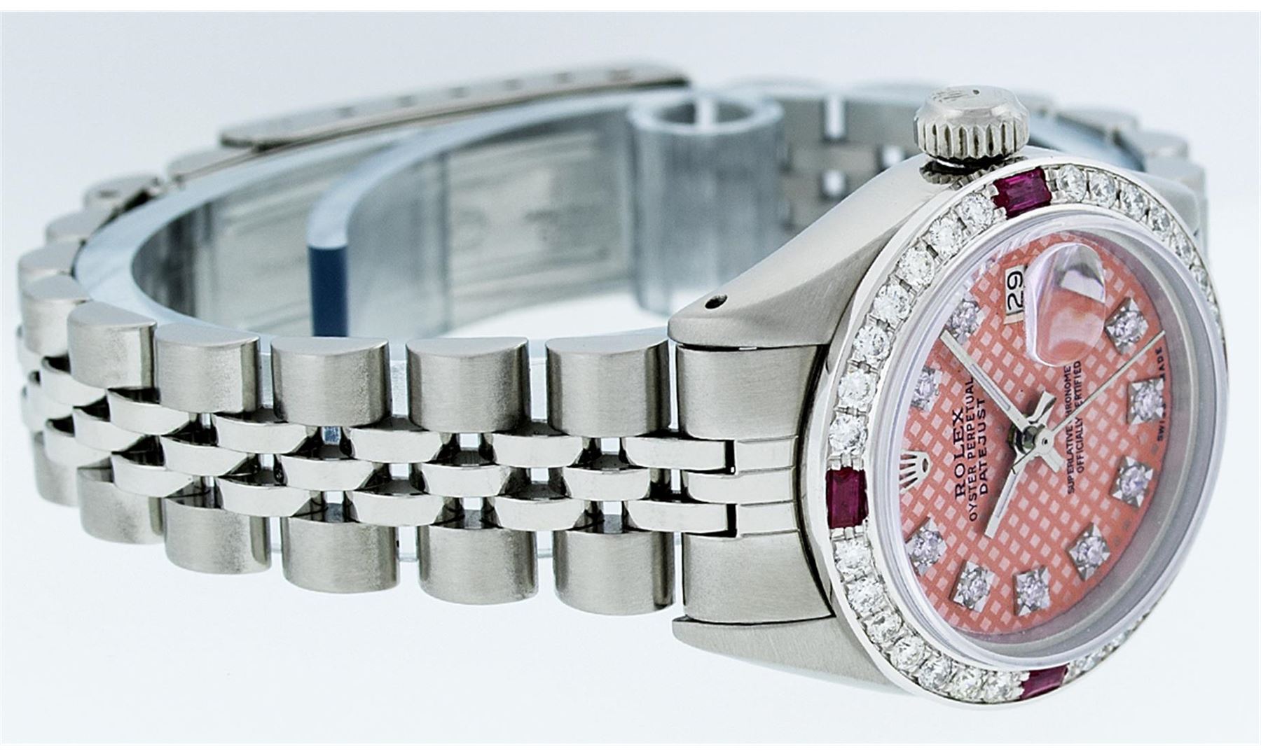 Ladies Rolex Datejust Polished Bright with Satin Finish, Serviced & Electronically Tested, Stainless Steel Case:26mm, Stainless Steel Crown, Custom Bezel: 18K White Gold Ruby Beadset Diamond Bezel, Diamond + Gem Count: 28 Diamonds + 4 Rubies. Total Weight .70 Carat, Clarity: SI-VS, Color: G to H. Custom Crystal: Synthetic Sapphire Cyclops Lens. Movement: Automatic Winding Movement Caliber 2030. Custom Dial: Refinished Salmon With VVS Diamond Hour Markers. Diamond Count: 10 Diamonds, Color: G To H, Clarity: VVS. Date Window: 3 O'clock Position Date Display, Model: Datejust. Condition: G-6 Extra Fine. Bracelet: Stainless Steel Jubilee. Bright Polish & Satin Finish. 6.0 Inch Length, Adjustable. Standard Clasp, With Rolex Logo. Comes with 6 month warranty.