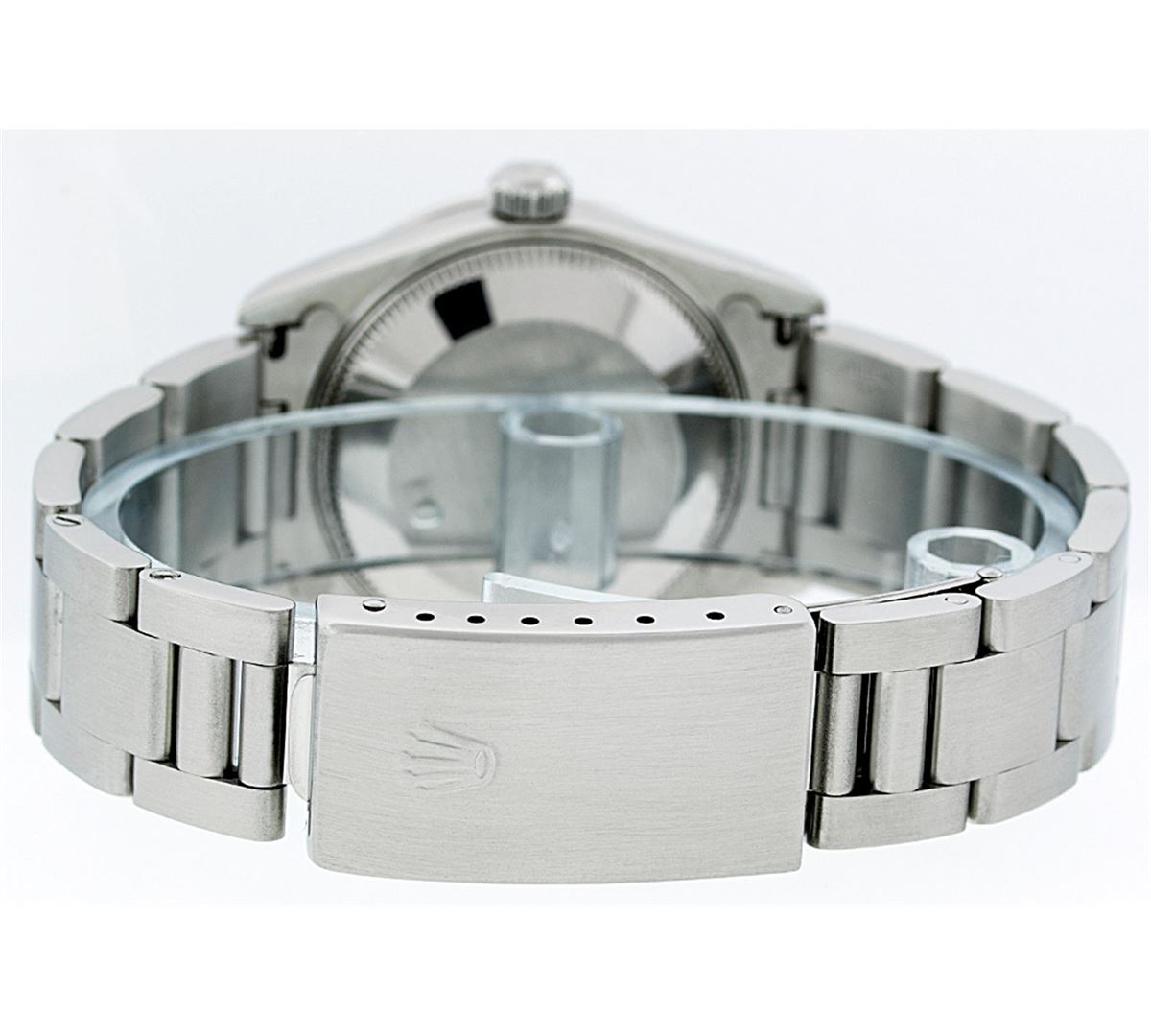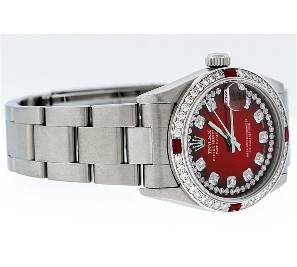 One Midsize Rolex Datejust Polished Bright with Satin Finish, Serviced & Electronically Tested, Stainless Steel Case:31mm, Stainless Steel Crown, Custom Bezel: 18K White Gold Beadset Ruby Beadset Bezel, Diamond Count: 4 Rubies + 28 Diamonds, Total Weight .70 Carat, Clarity: SI-VS, Color: G to H. Custom Crystal: Synthetic Sapphire Cyclops Lens. Movement: Automatic Winding Movement Caliber 2235. Custom Dial: Refinished Red Vignette String Diamond Dial VVS, 43 Diamonds in Dial G To H In Color, Clarity: VVS. Date Window: 3 O'clock Position Date Display, Model: No Hole Datejust Quickset. Condition: G-6 Extra Fine. Bracelet: Stainless Steel Oyster Band. Bright Polish & Satin Finish. 6.0 Inch Length, Adjustable. Standard Clasp, With Rolex Logo. Comes with 6 month warranty.
