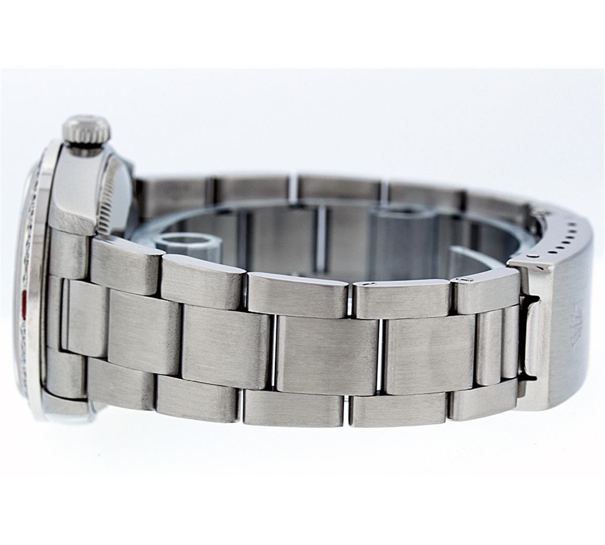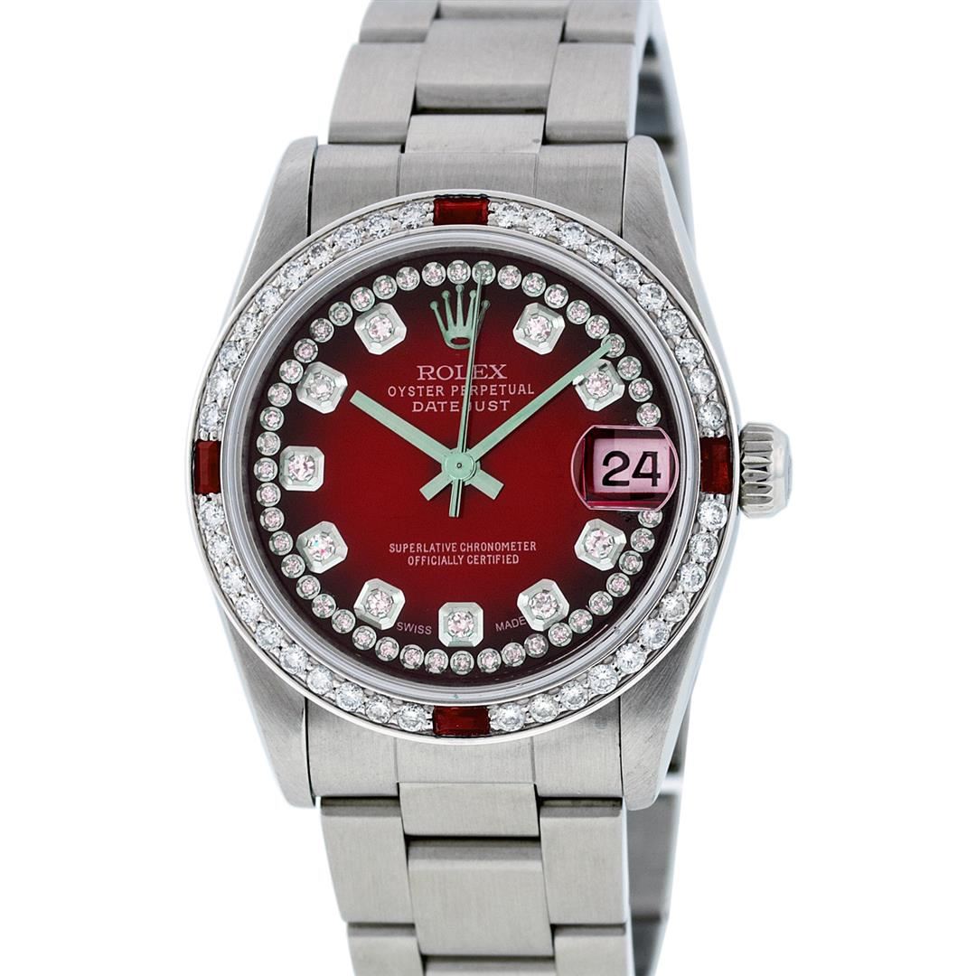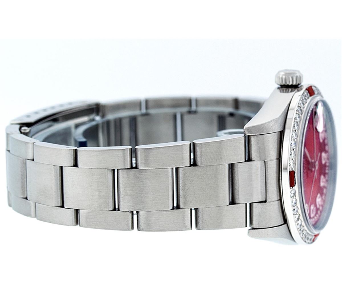 One Midsize Rolex Datejust Polished Bright with Satin Finish, Serviced & Electronically Tested, Stainless Steel Case:31mm, Stainless Steel Crown, Custom Bezel: 18K White Gold Beadset Ruby Beadset Bezel, Diamond Count: 4 Rubies + 28 Diamonds, Total Weight .70 Carat, Clarity: SI-VS, Color: G to H. Custom Crystal: Synthetic Sapphire Cyclops Lens. Movement: Automatic Winding Movement Caliber 2235. Custom Dial: Refinished Red Vignette String Diamond Dial VVS, 43 Diamonds in Dial G To H In Color, Clarity: VVS. Date Window: 3 O'clock Position Date Display, Model: No Hole Datejust Quickset. Condition: G-6 Extra Fine. Bracelet: Stainless Steel Oyster Band. Bright Polish & Satin Finish. 6.0 Inch Length, Adjustable. Standard Clasp, With Rolex Logo. Comes with 6 month warranty.
