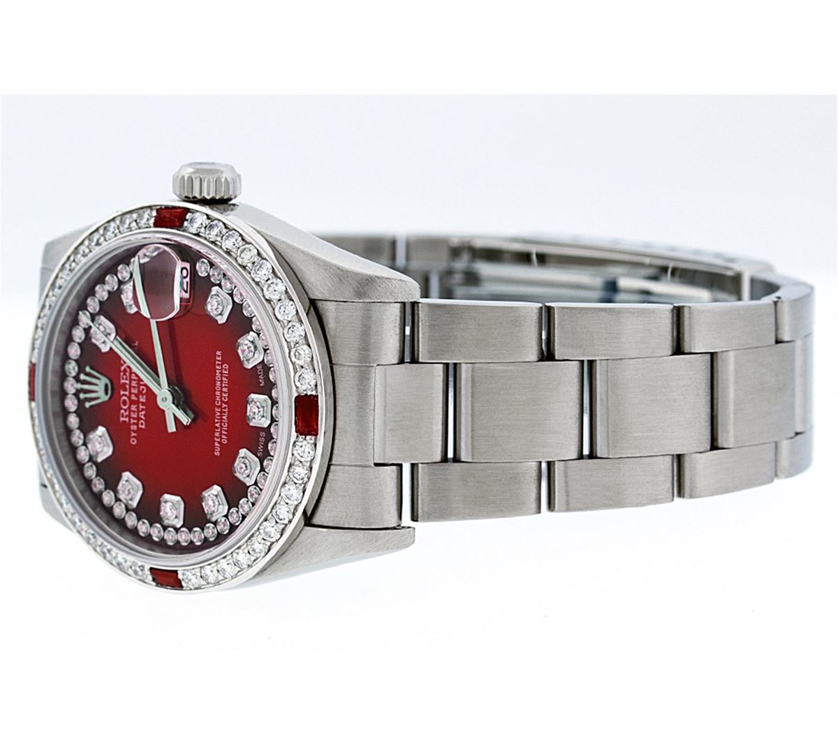 One Midsize Rolex Datejust Polished Bright with Satin Finish, Serviced & Electronically Tested, Stainless Steel Case:31mm, Stainless Steel Crown, Custom Bezel: 18K White Gold Beadset Ruby Beadset Bezel, Diamond Count: 4 Rubies + 28 Diamonds, Total Weight .70 Carat, Clarity: SI-VS, Color: G to H. Custom Crystal: Synthetic Sapphire Cyclops Lens. Movement: Automatic Winding Movement Caliber 2235. Custom Dial: Refinished Red Vignette String Diamond Dial VVS, 43 Diamonds in Dial G To H In Color, Clarity: VVS. Date Window: 3 O'clock Position Date Display, Model: No Hole Datejust Quickset. Condition: G-6 Extra Fine. Bracelet: Stainless Steel Oyster Band. Bright Polish & Satin Finish. 6.0 Inch Length, Adjustable. Standard Clasp, With Rolex Logo. Comes with 6 month warranty.