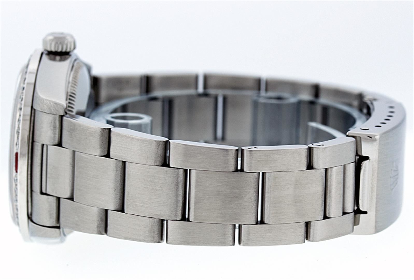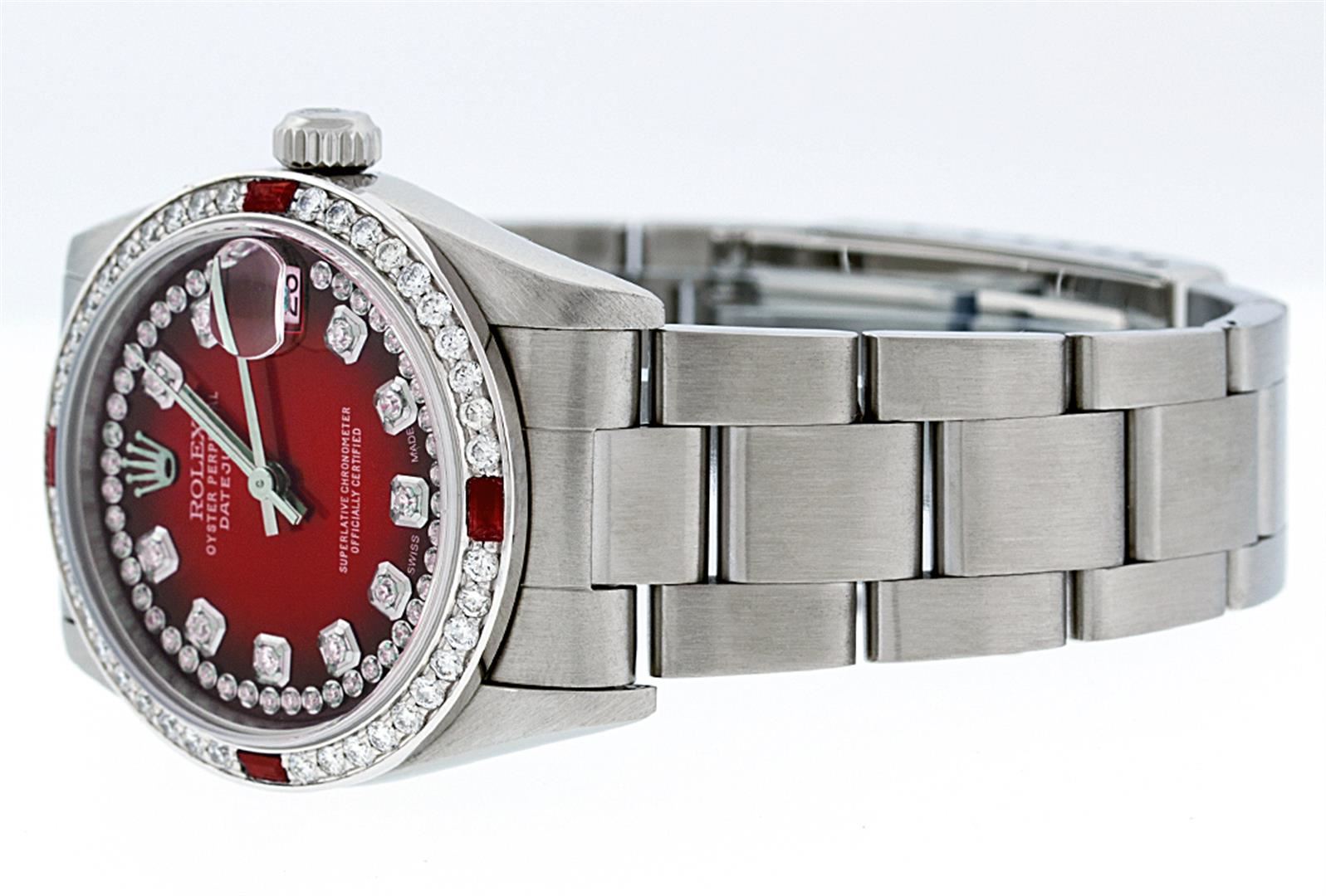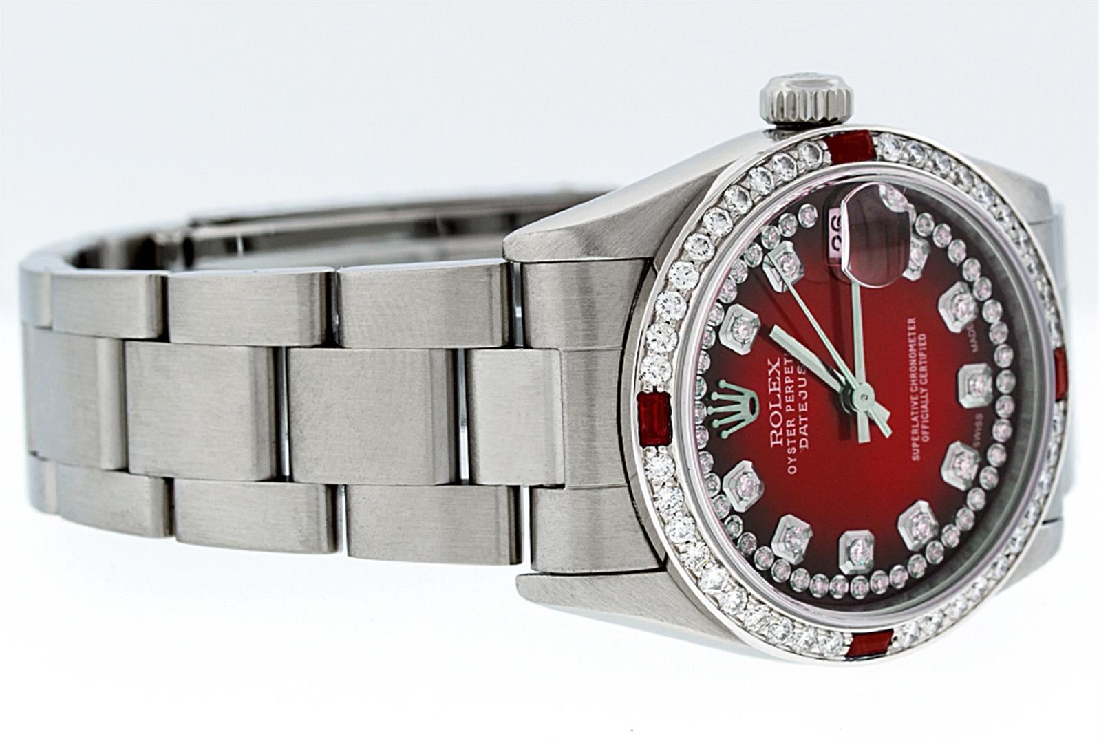 One Midsize Rolex Datejust Polished Bright with Satin Finish, Serviced & Electronically Tested, Stainless Steel Case:31mm, Stainless Steel Crown, Custom Bezel: 18K White Gold Beadset Ruby Beadset Bezel, Diamond Count: 4 Rubies + 28 Diamonds, Total Weight .70 Carat, Clarity: SI-VS, Color: G to H. Custom Crystal: Synthetic Sapphire Cyclops Lens. Movement: Automatic Winding Movement Caliber 2235. Custom Dial: Refinished Red Vignette String Diamond Dial VVS, 43 Diamonds in Dial G To H In Color, Clarity: VVS. Date Window: 3 O'clock Position Date Display, Model: No Hole Datejust Quickset. Condition: G-6 Extra Fine. Bracelet: Stainless Steel Oyster Band. Bright Polish & Satin Finish. 6.0 Inch Length, Adjustable. Standard Clasp, With Rolex Logo. Comes with 6 month warranty.