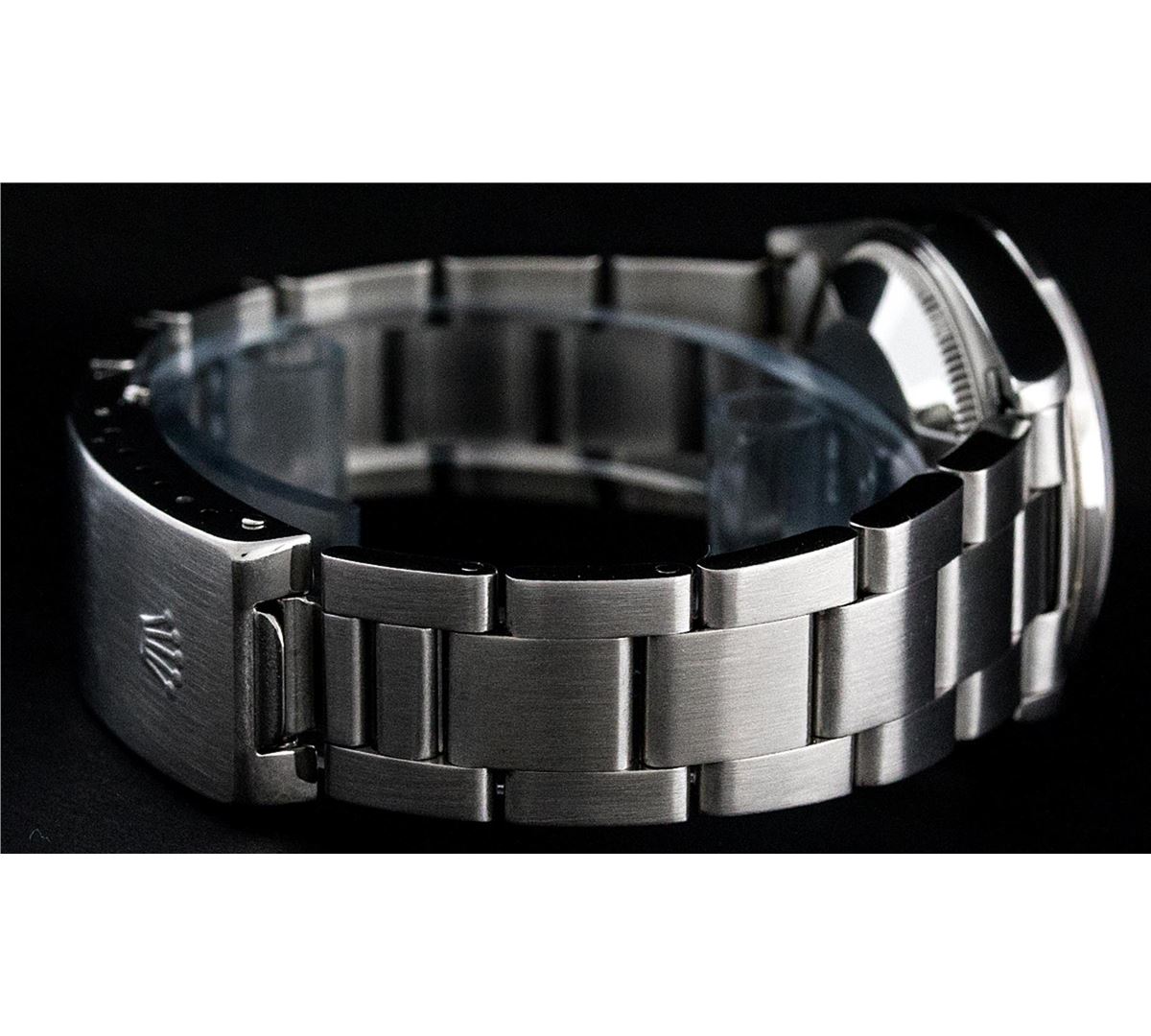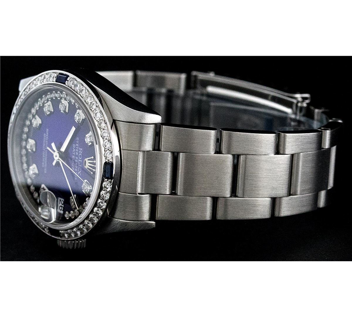 One Midsize Stainless Steel Rolex Datejust Polished, Serviced & Electronically Tested, Stainless Steel Case Case:31mm, Stainless Steel Crown, Custom Bezel: 18K White Gold Sapphire Beadset Bezel, Diamond Count: 40 Diamonds + 4 Sapphires, Color: G To H, Clarity: VS2-SI1. Custom Crystal: Synthetic Sapphire Cyclops Lens. Movement: Automatic Winding Movement Caliber 2135. Custom Dial: Blue Vignette String Diamond Dial VVS. Color: G to H, Clarity: VS2-SI1, Date Window: 3 O'Clock Position Date Display, Quickset, Model: Midsize Datejust. Condition: G-6 Extra Fine. Bracelet: Stainless Steel Oyster Band. Bright Polish. 6.0 Inch Length, Adjustable. Standard Clasp, With Rolex Logo. Comes with 6 month warranty.