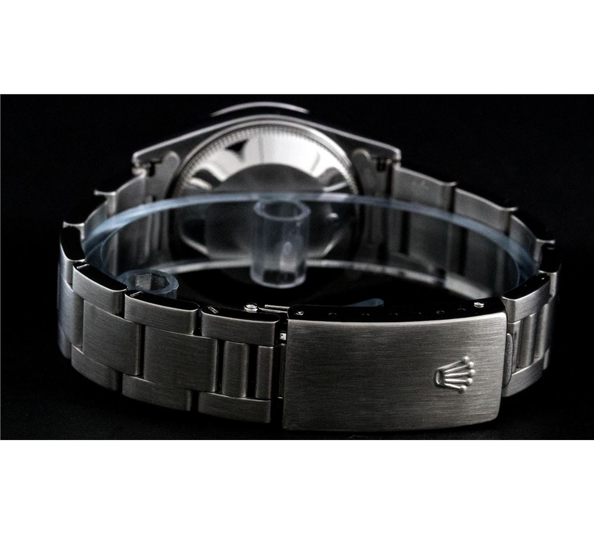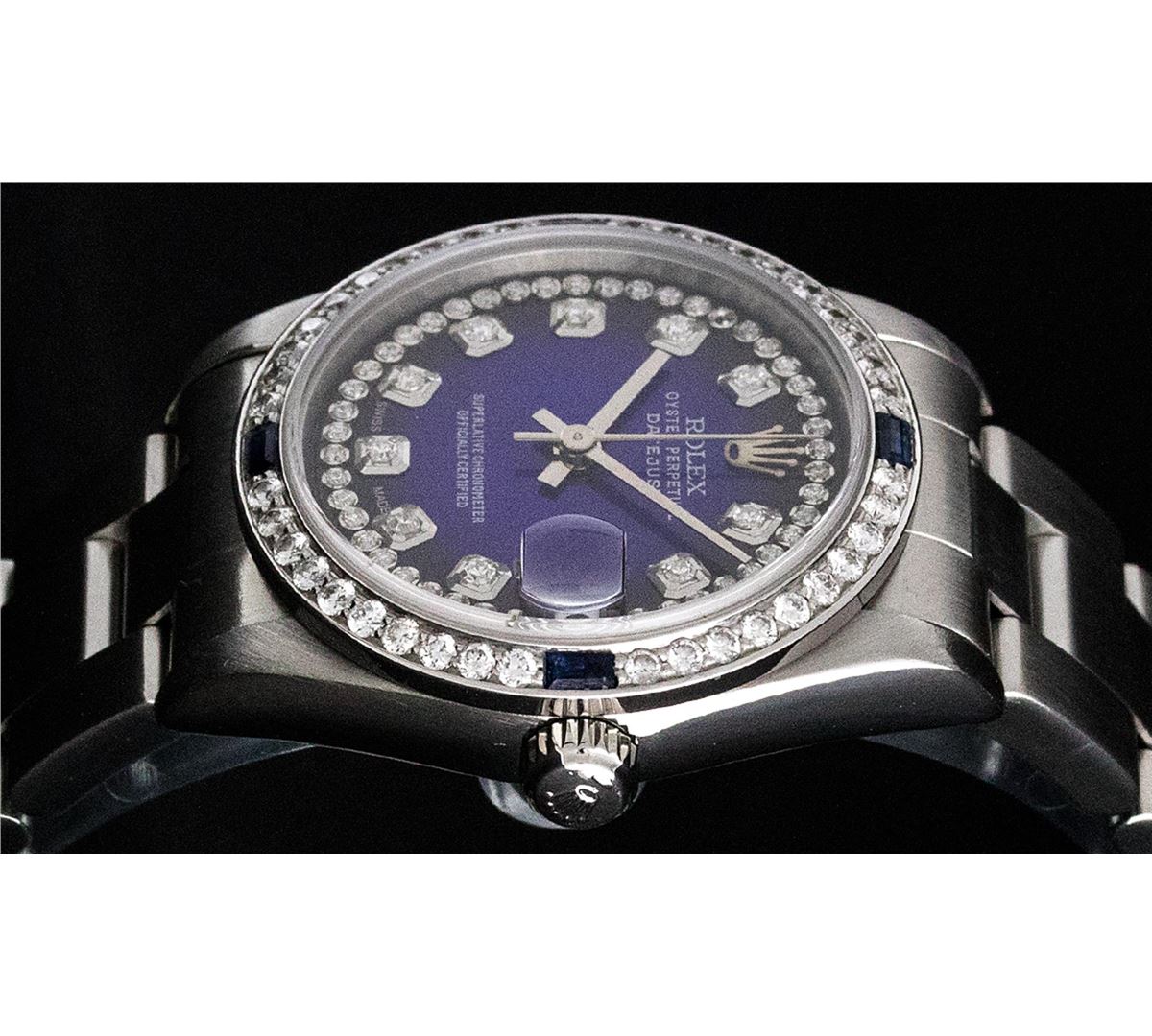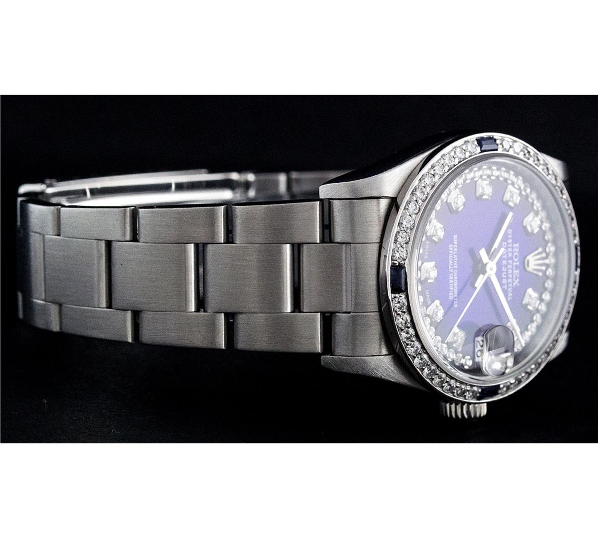 One Midsize Stainless Steel Rolex Datejust Polished, Serviced & Electronically Tested, Stainless Steel Case Case:31mm, Stainless Steel Crown, Custom Bezel: 18K White Gold Sapphire Beadset Bezel, Diamond Count: 40 Diamonds + 4 Sapphires, Color: G To H, Clarity: VS2-SI1. Custom Crystal: Synthetic Sapphire Cyclops Lens. Movement: Automatic Winding Movement Caliber 2135. Custom Dial: Blue Vignette String Diamond Dial VVS. Color: G to H, Clarity: VS2-SI1, Date Window: 3 O'Clock Position Date Display, Quickset, Model: Midsize Datejust. Condition: G-6 Extra Fine. Bracelet: Stainless Steel Oyster Band. Bright Polish. 6.0 Inch Length, Adjustable. Standard Clasp, With Rolex Logo. Comes with 6 month warranty.