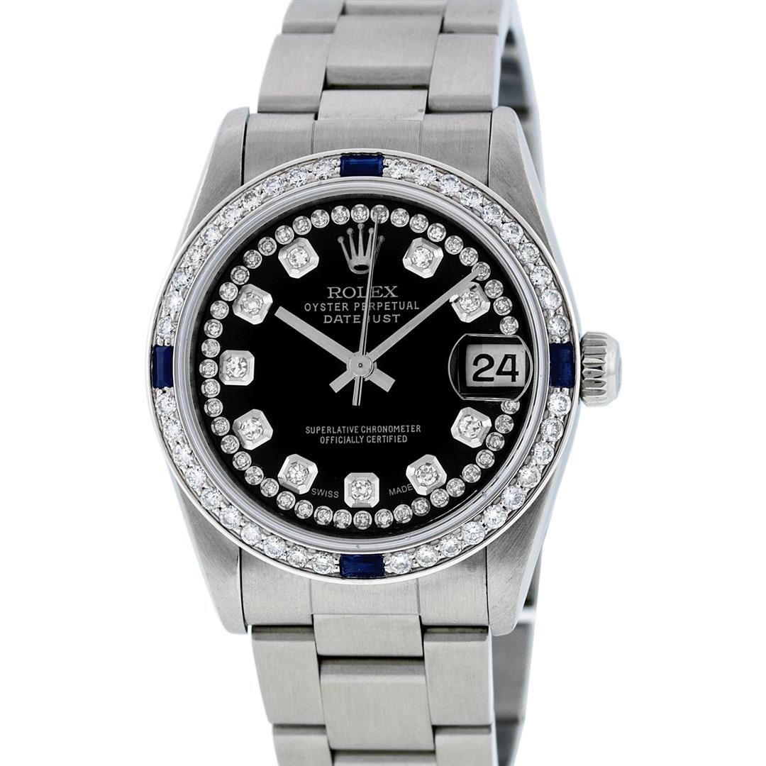 One Midsize Rolex Datejust Polished Bright with Satin Finish, Serviced & Electronically Tested, Stainless Steel Case:26mm, Stainless Steel Crown, Custom Bezel: 18K White Gold Beadset Sapphire Beadset Bezel, Diamond Count: 4 Sapphire + 28 Diamonds, Total Weight .70 Carat, Clarity: SI-VS, Color: G to H. Custom Crystal: Synthetic Sapphire Cyclops Lens. Movement: Automatic Winding Movement Caliber 2235. Custom Dial: Refinished Black String Diamond Dial VVS, 43 Diamonds in Dial G To H In Color, Clarity: VVS. Date Window: 3 O'clock Position Date Display, Model: No Hole Datejust Quickset. Condition: G-6 Extra Fine. Bracelet: Stainless Steel Oyster Band. Bright Polish & Satin Finish. 6.0 Inch Length, Adjustable. Standard Clasp, With Rolex Logo. Comes with 6 month warranty.
