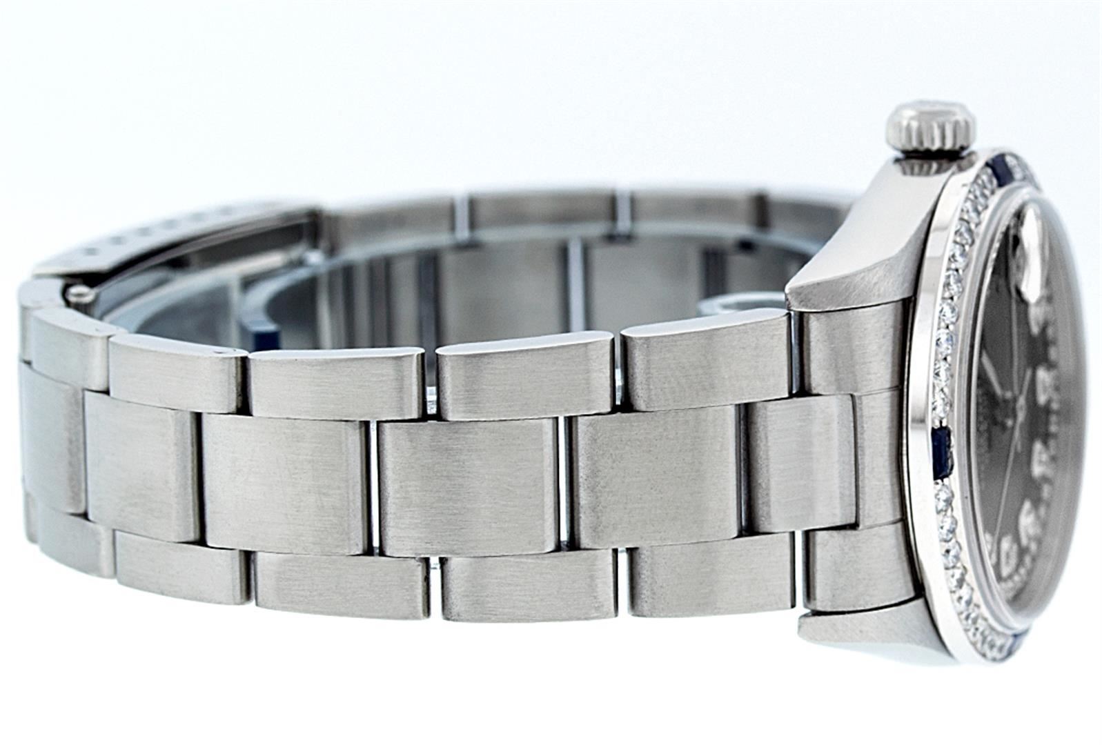 One Midsize Rolex Datejust Polished Bright with Satin Finish, Serviced & Electronically Tested, Stainless Steel Case:26mm, Stainless Steel Crown, Custom Bezel: 18K White Gold Beadset Sapphire Beadset Bezel, Diamond Count: 4 Sapphire + 28 Diamonds, Total Weight .70 Carat, Clarity: SI-VS, Color: G to H. Custom Crystal: Synthetic Sapphire Cyclops Lens. Movement: Automatic Winding Movement Caliber 2235. Custom Dial: Refinished Black String Diamond Dial VVS, 43 Diamonds in Dial G To H In Color, Clarity: VVS. Date Window: 3 O'clock Position Date Display, Model: No Hole Datejust Quickset. Condition: G-6 Extra Fine. Bracelet: Stainless Steel Oyster Band. Bright Polish & Satin Finish. 6.0 Inch Length, Adjustable. Standard Clasp, With Rolex Logo. Comes with 6 month warranty.