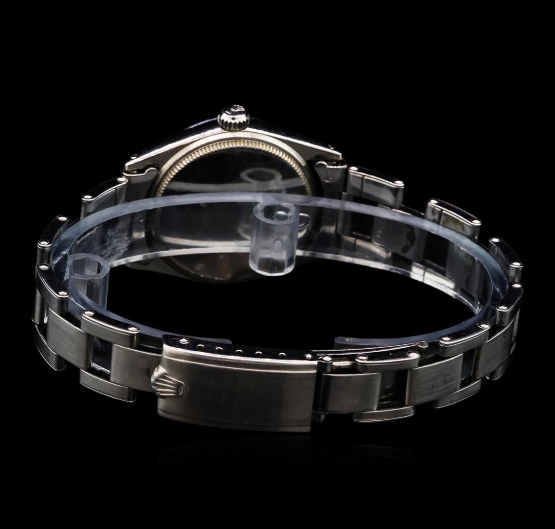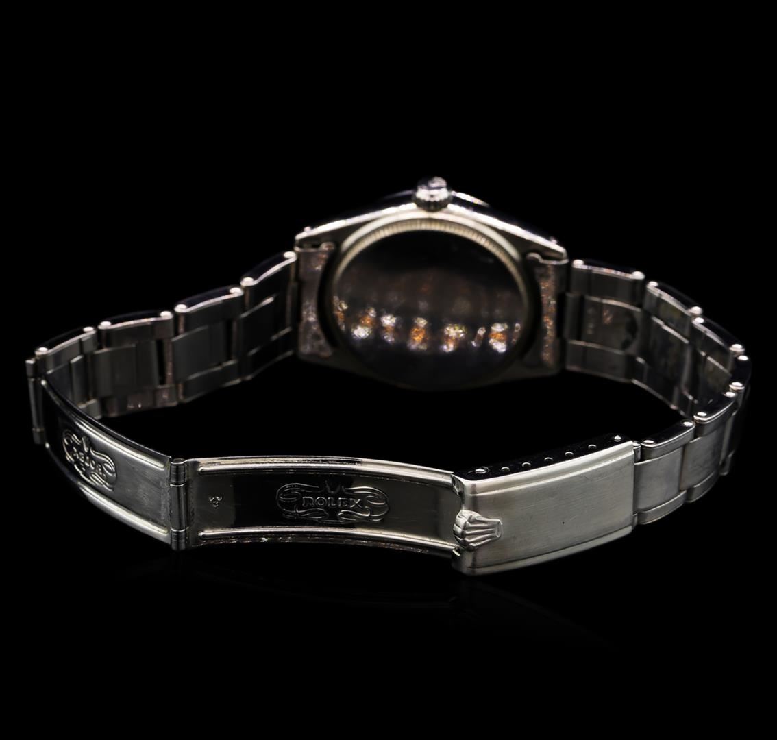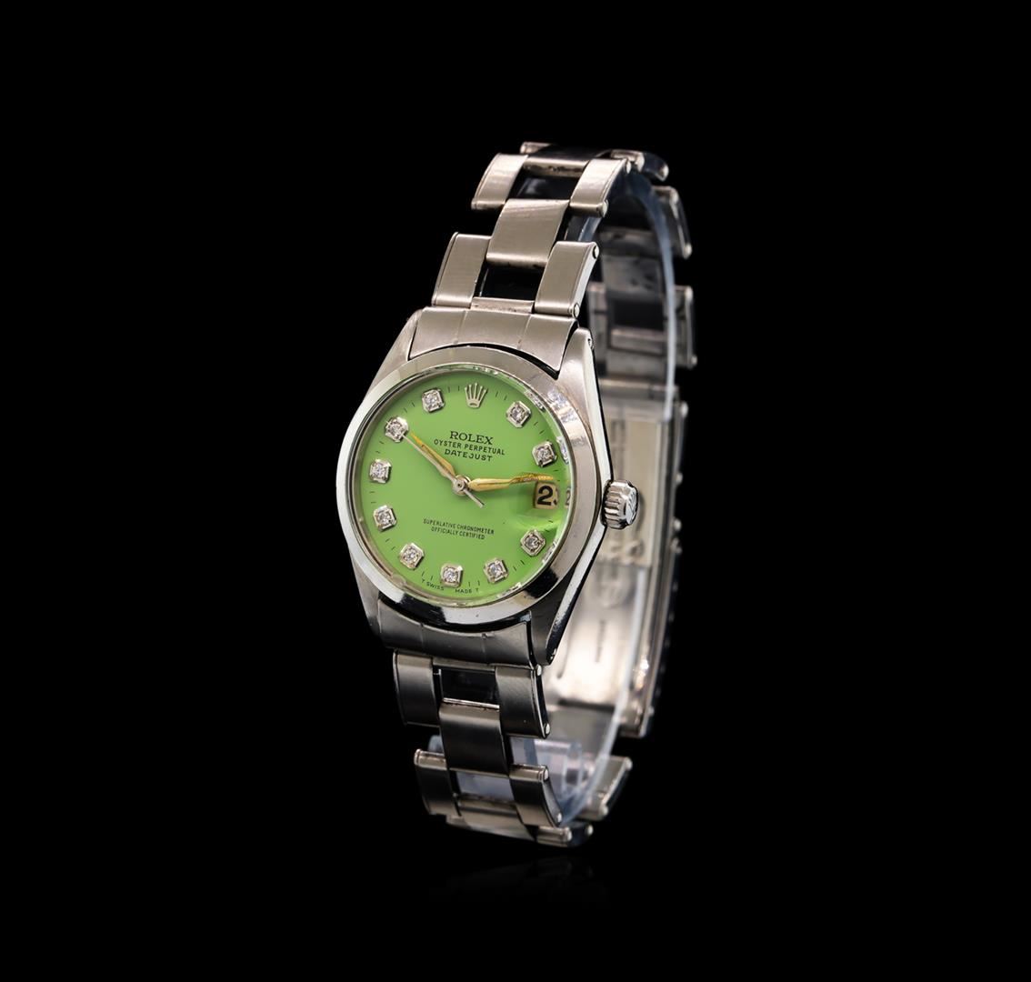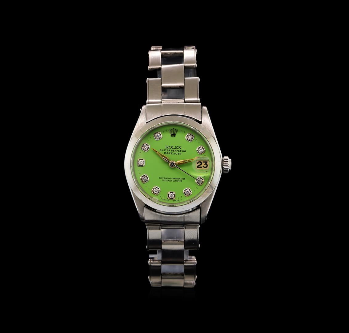 One, hand crafted & machine milled vintage Rolex, the Mid-Size DateJust wristwatch electronically tested Stainless Steel, Case: 30mm oyster, Crown: twinlock with logo, Bezel: high polish finish, Crystal: acrylic cyclops lens, Circa: 1951. Movement: superlative chronometer, Rolex signed Customized Dial: Green color, with baton hands, and diamond markers, Date Window: 3 o'clock position, non-quick-set, Rolex Bracelet: Stainless Steel tapering oyster links, bright polish & brushed finish, Condition: G-5 Fine. Six and one half inch length, adjustable. Standard Rolex clasp, with logo. Total Weight of Watch 47.07gm. AIG Appraised at $4,990.00.
