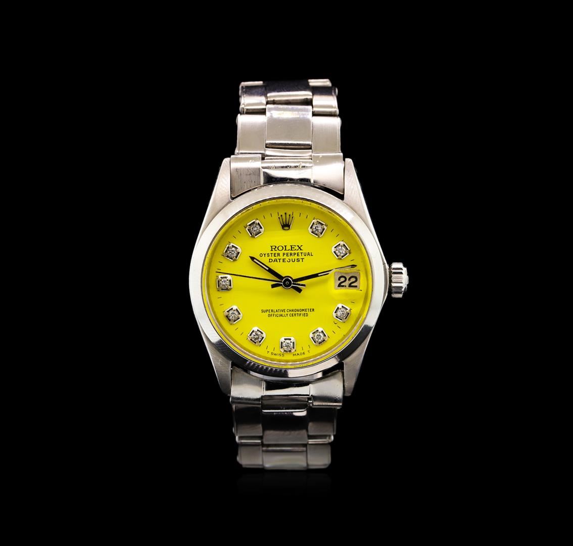 One, hand crafted & machine milled vintage Rolex, the Mid-Size DateJust wristwatch electronically tested Stainless Steel, Case: 30mm oyster, Crown: twinlock with logo, Bezel: high polish finish, Crystal: acrylic cyclops lens, Circa: 1964. Movement: superlative chronometer, Rolex signed Customized Dial: Yellow color, with baton hands, and diamond markers, Date Window: 3 o'clock position, non-quick-set, Rolex Bracelet: Stainless Steel tapering oyster links, bright polish & brushed finish, Condition: G-5 Fine. Six and one half inch length, adjustable. Standard Rolex clasp, with logo. Total Weight of Watch 48.27gm. AIG Appraised at $4,990.00.