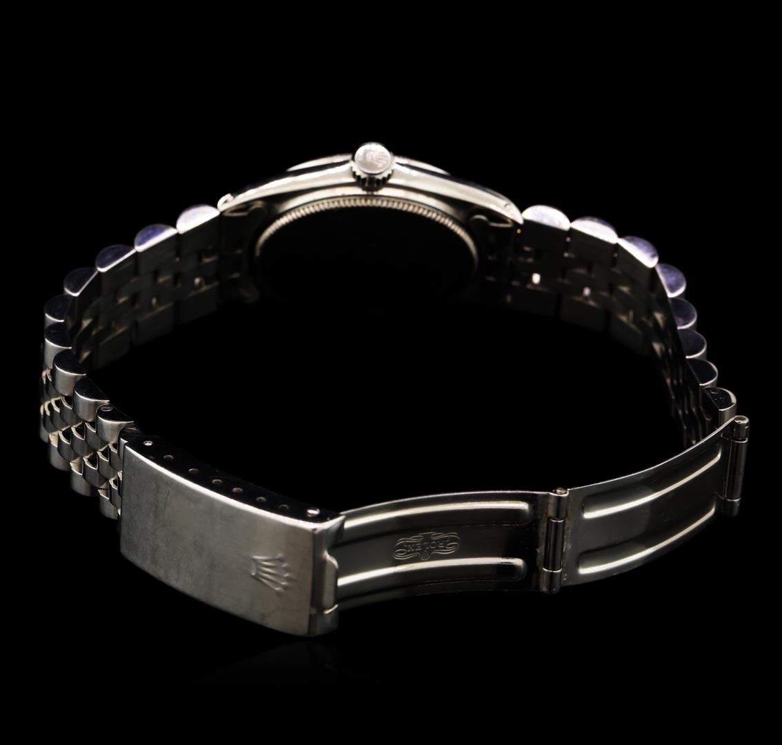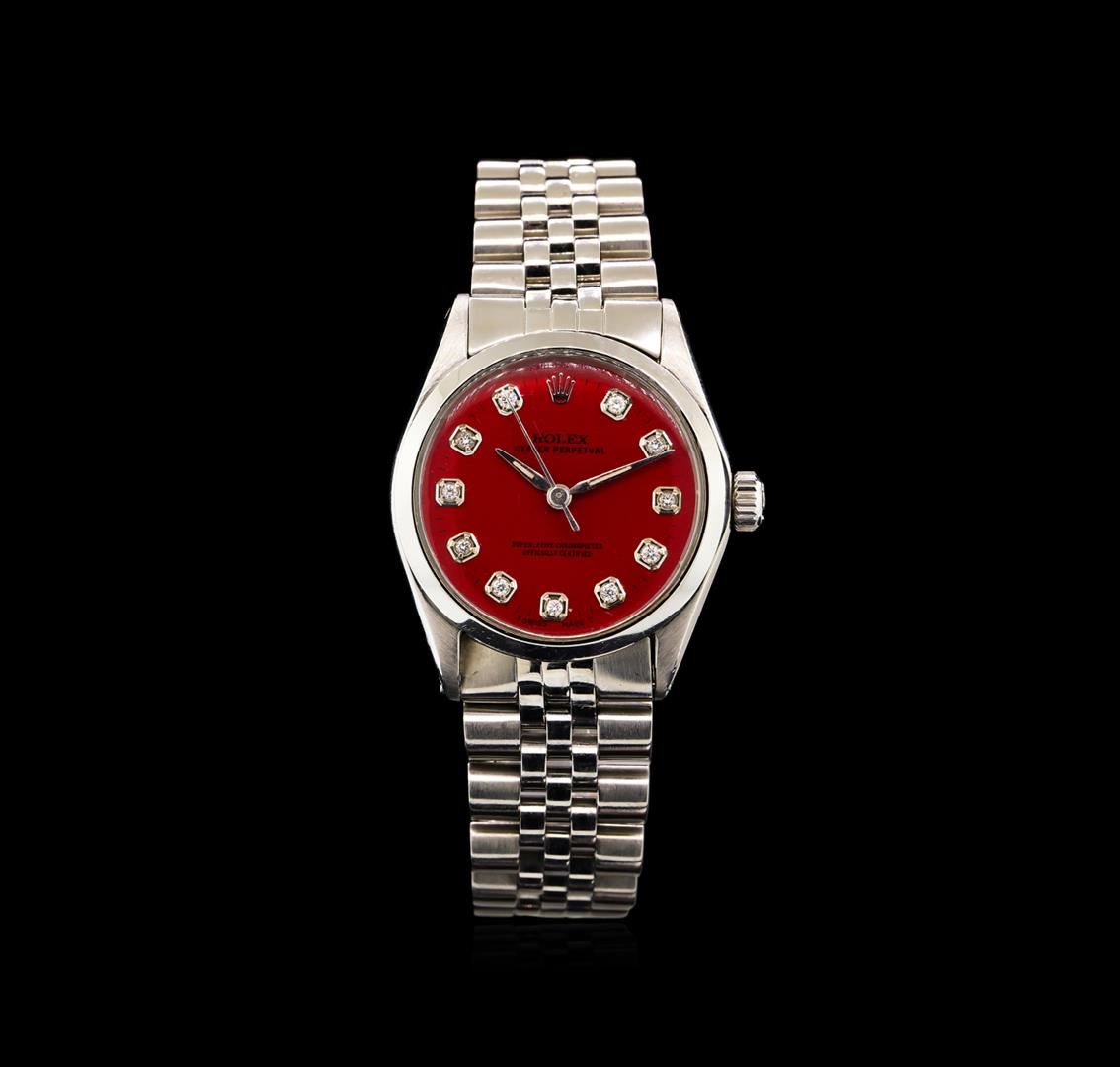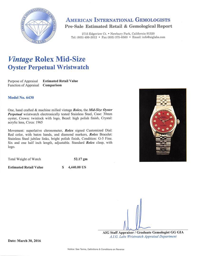 One, hand crafted & machine milled vintage Rolex, the Mid-Size Oyster Perpetual wristwatch electronically tested Stainless Steel, Case: 30mm oyster, Crown: twinlock with logo, Bezel: high polish finish, Crystal: acrylic lens, Circa: 1965. Movement: superlative chronometer, Rolex signed Customized Dial: Red color, with baton hands, and diamond markers, Rolex Bracelet: Stainless Steel jubilee links, bright polish finish, Condition: G-5 Fine. Six and one half inch length, adjustable. Standard Rolex clasp, with logo. Total Weight of Watch 52.17gm. AIG Appraised at $4,440.00.