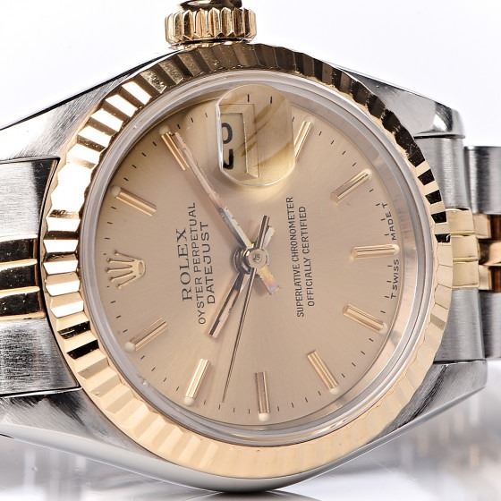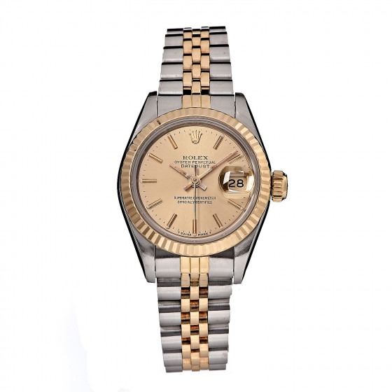 Champagne 69173 timepiece is crafted of stainless steel and 18 karat yellow gold along the jubilee bracelet, fluted gold bezel and crown. Features also include a brushed champagne dial, a magnified date display, and automatic movement.