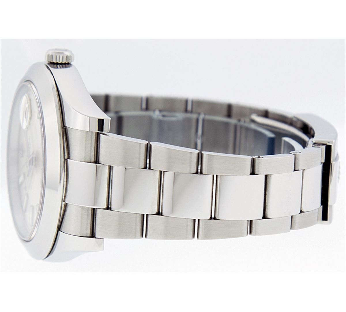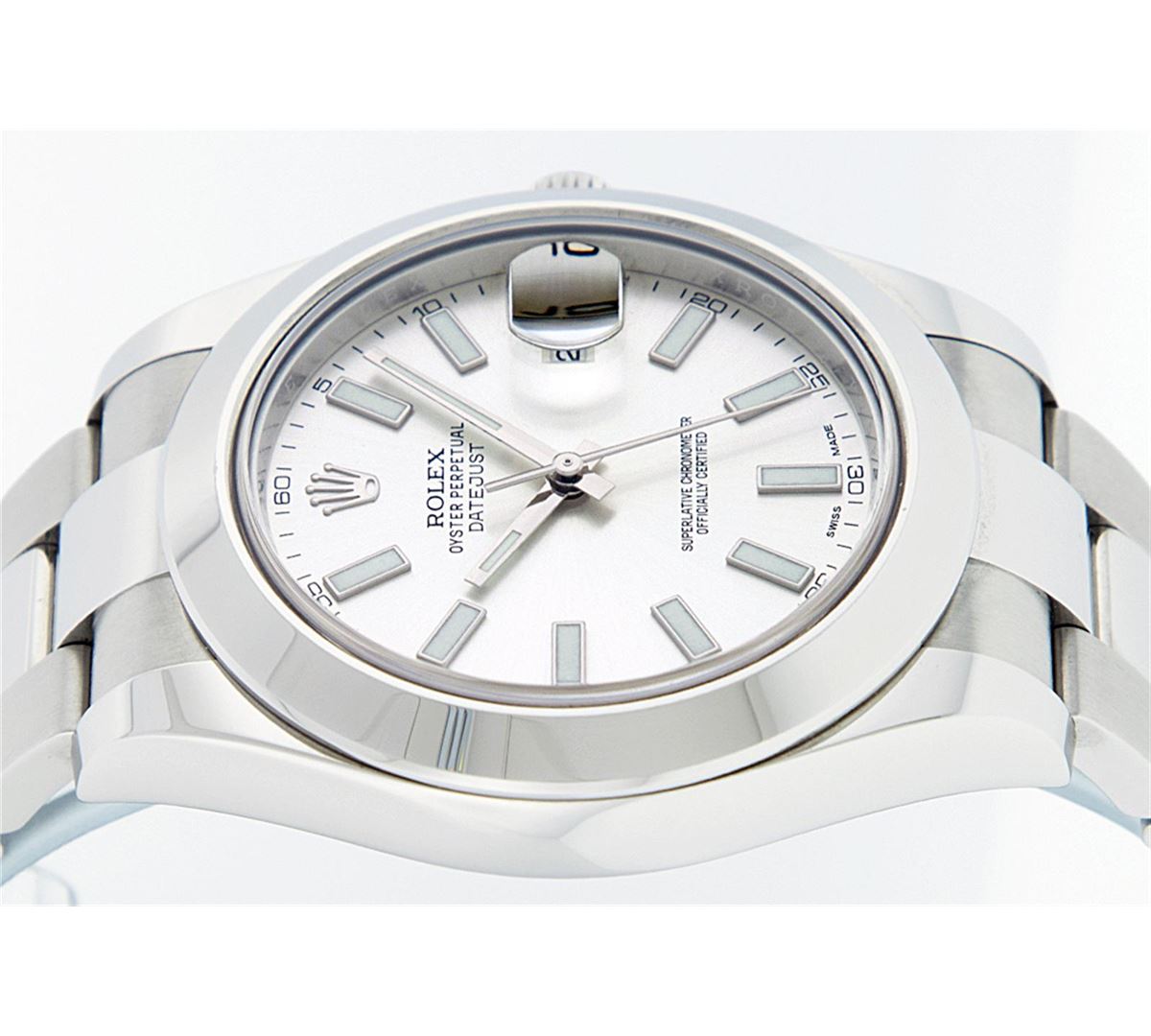 One Mens Rolex Datejust 2 Polished Bright with Satin Finish, Serviced & Electronically Tested, Stainless Steel Case:41mm, Stainless Steel Crown, Bezel: Stainless Steel Smooth Bezel, . Crystal: Synthetic Sapphire Cyclops Lens. Movement: Automatic Winding Movement Caliber 3136. Dial: White Index With Line Track. Date Window: 3 O'Clock Position Date Display, Quickset, Model: 116300 Datejust 2. Condition: G-6 Extra Fine. Bracelet: Stainless Steel Oyster Band. Bright Polish & Satin Finish. 7.5 Inch Length, Adjustable. Standard Clasp, With Rolex Logo. Comes with a 6 month warranty card.