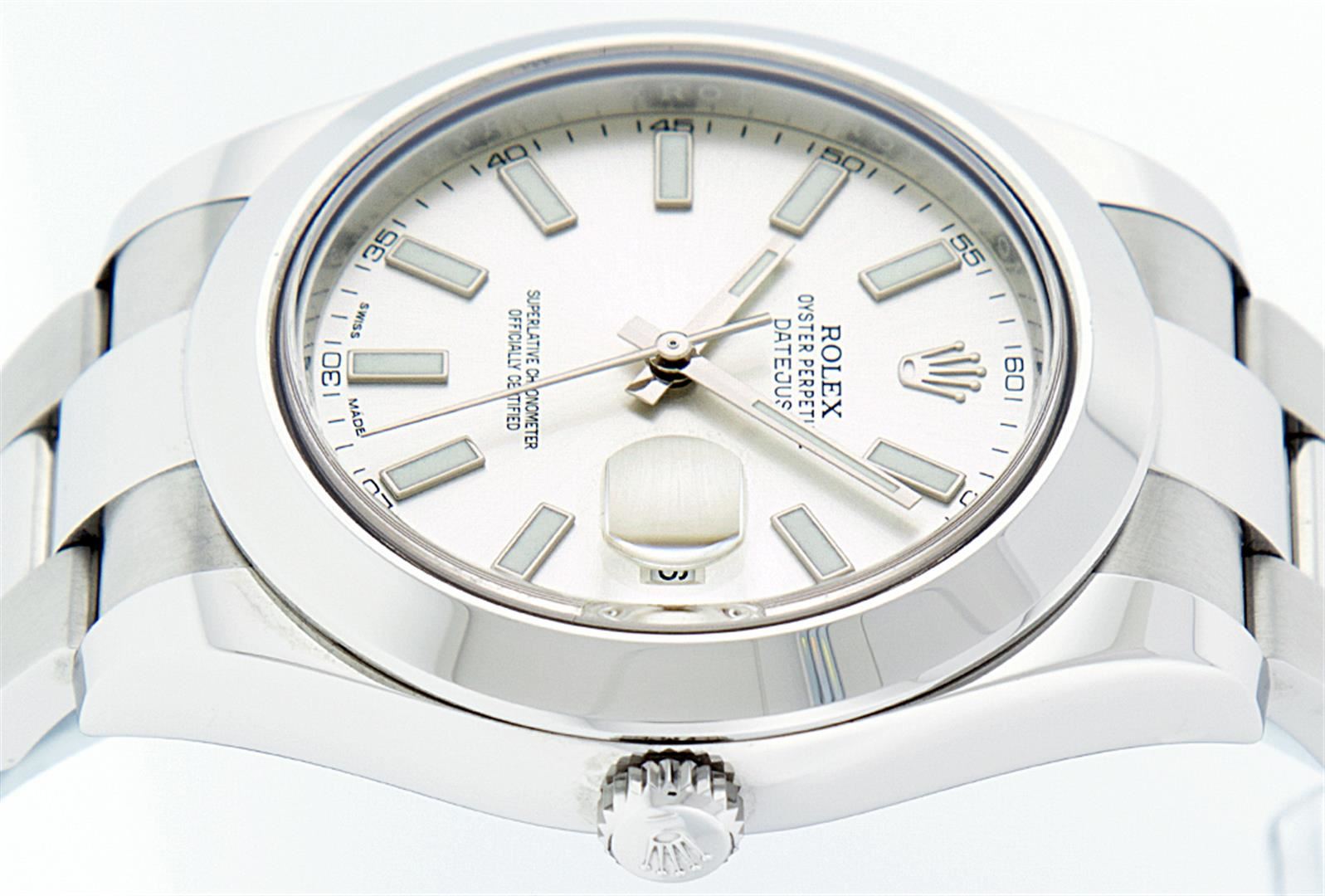 One Mens Rolex Datejust 2 Polished Bright with Satin Finish, Serviced & Electronically Tested, Stainless Steel Case:41mm, Stainless Steel Crown, Bezel: Stainless Steel Smooth Bezel, . Crystal: Synthetic Sapphire Cyclops Lens. Movement: Automatic Winding Movement Caliber 3136. Dial: White Index With Line Track. Date Window: 3 O'Clock Position Date Display, Quickset, Model: 116300 Datejust 2. Condition: G-6 Extra Fine. Bracelet: Stainless Steel Oyster Band. Bright Polish & Satin Finish. 7.5 Inch Length, Adjustable. Standard Clasp, With Rolex Logo. Comes with a 6 month warranty card.