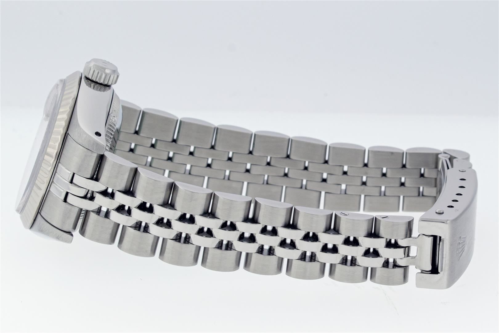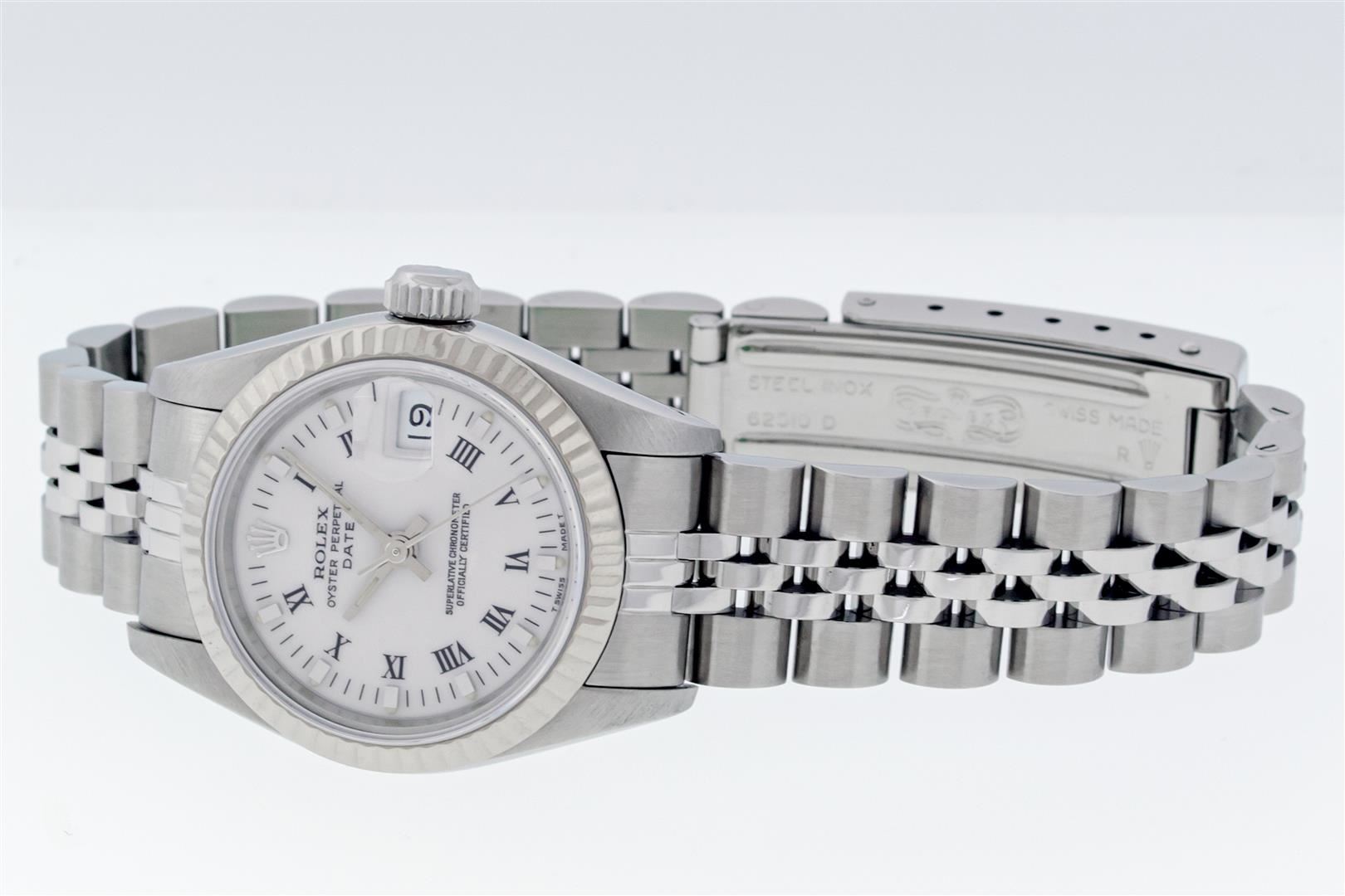 One Ladies Pre Owned Stainless Steel Rolex Polished Bright with Satin Finish, Serviced & Electronically Tested, Stainless Steel Case: 26mm, Stainless Steel Crown, Rolex Bezel: 14K White Gold Fluted Bezel, Custom Crystal: New With Magnifying Date Window. Hands: Luminescent Hands. Rolex Movement: Automatic Winding Movement. Rolex Dial: Factory White Roman Dial With Index Hour Markers And Lumi Dots. Date Window: 3 O'Clock Position Date Display, Model: Datejust. Condition: G-6 Extra Fine. Rolex Bracelet: Stainless Steel Jubilee Band. Bright Polish & Satin Finish. 6.0 Inch Length, Adjustable. Standard Clasp, With Rolex Logo. This Watch Has Been Serviced Time Tested And Is In Excellent Condition It Is Free Of All Scratches And Dents.