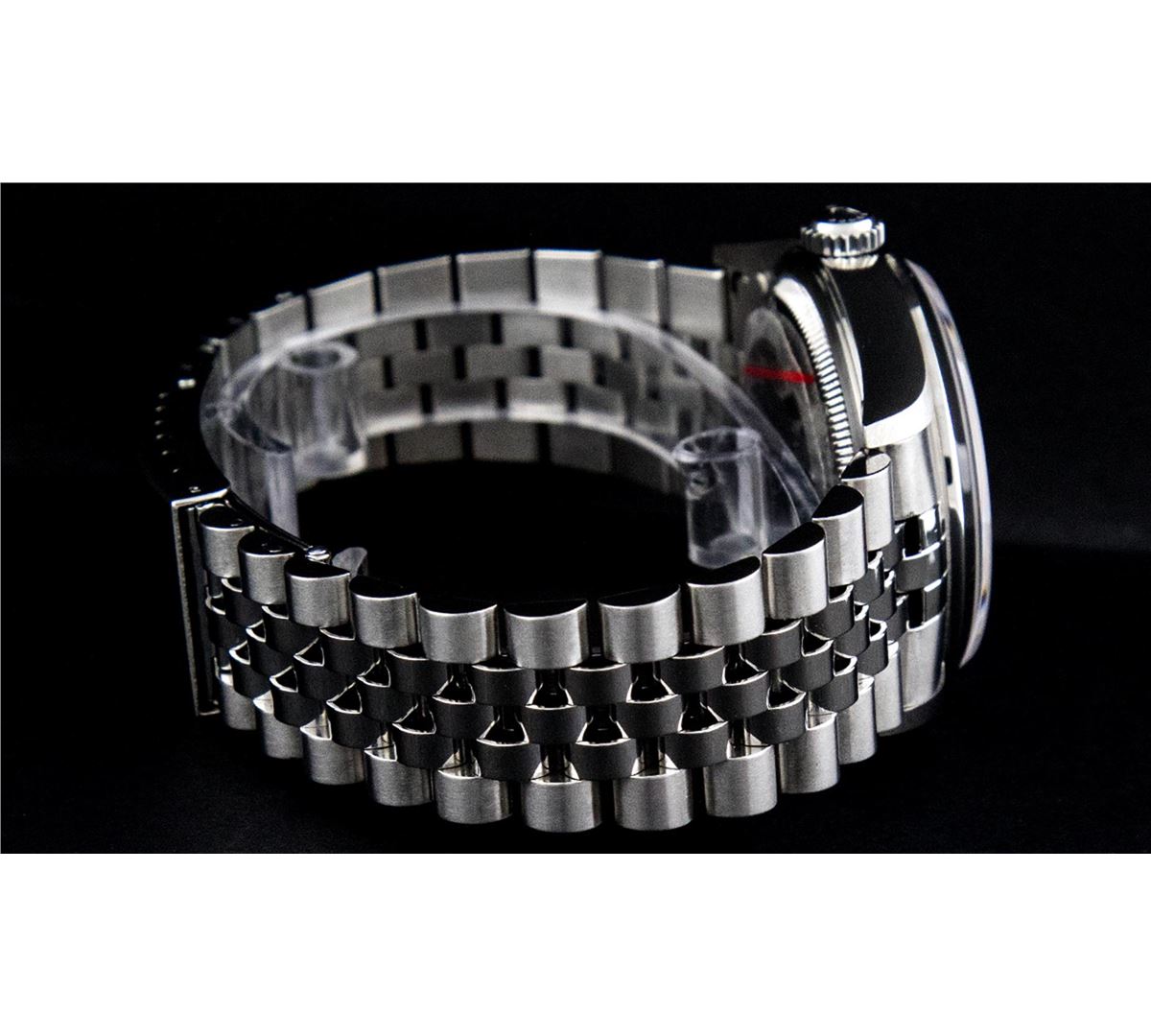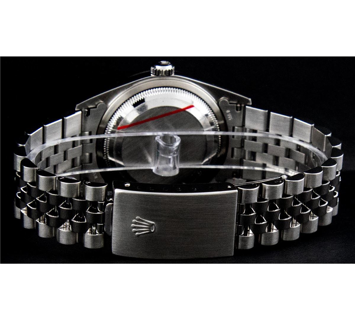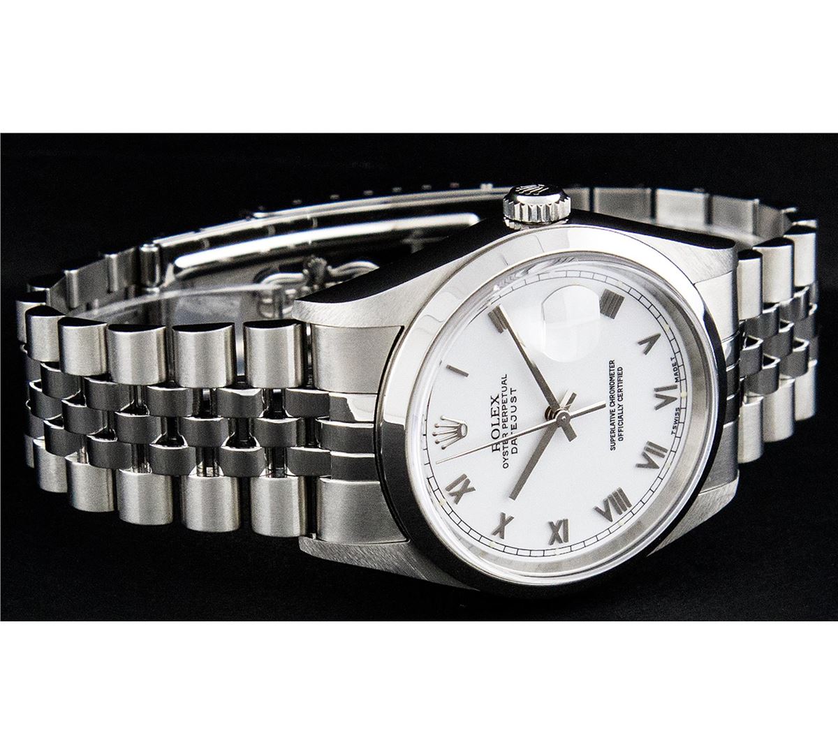 One Mens Rolex Datejust Polished Bright with Satin Finish, Serviced & Electronically Tested, Stainless Steel Case: 36mm, Stainless Steel Crown, Bezel: Stainless Steel Smooth Bezel. Crystal: Synthetic Sapphire Cyclops Lens. Movement: Automatic Winding Movement Caliber 3135. Dial: White Roman Dial. Date Window: 3 O'Clock Position Date Display, Quickset, Model: 16200. Condition: G-6 Extra Fine. Bracelet: Stainless Steel Jubilee. Bright Polish & Satin Finish. 7.0 Inch Length, Adjustable. Standard Clasp, With Rolex Logo. Comes with 6 month warranty.
